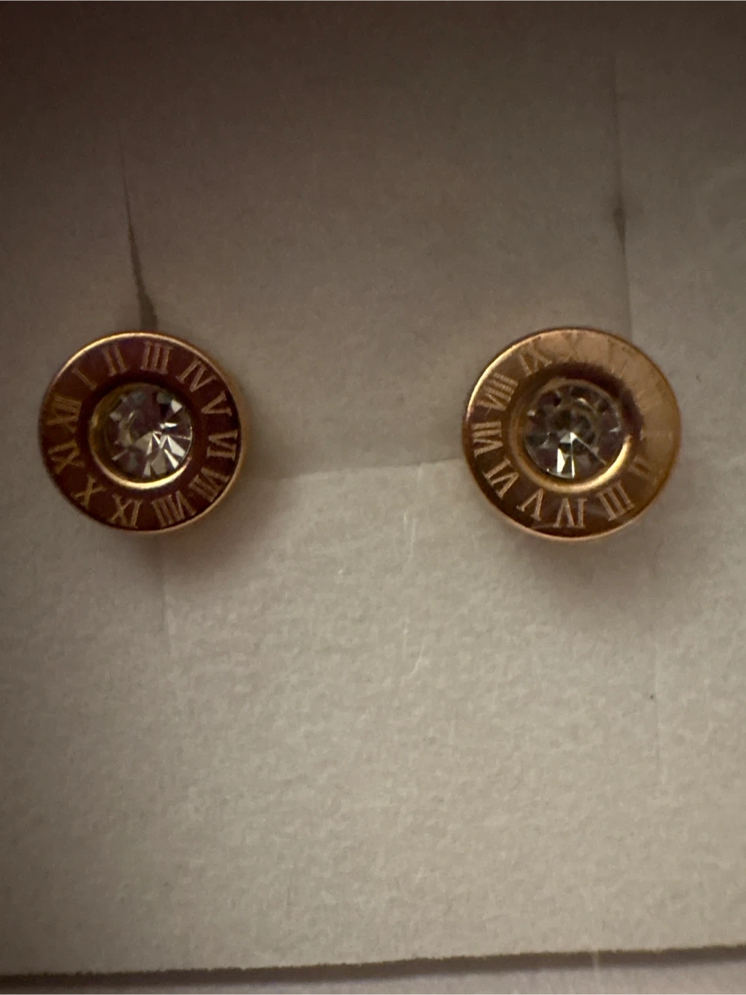 These are a pair of rose gold stainless steel stud earrings, each featuring a CZ stone in the center and Roman numerals around the edge. They come in a box, ready for gifting! New