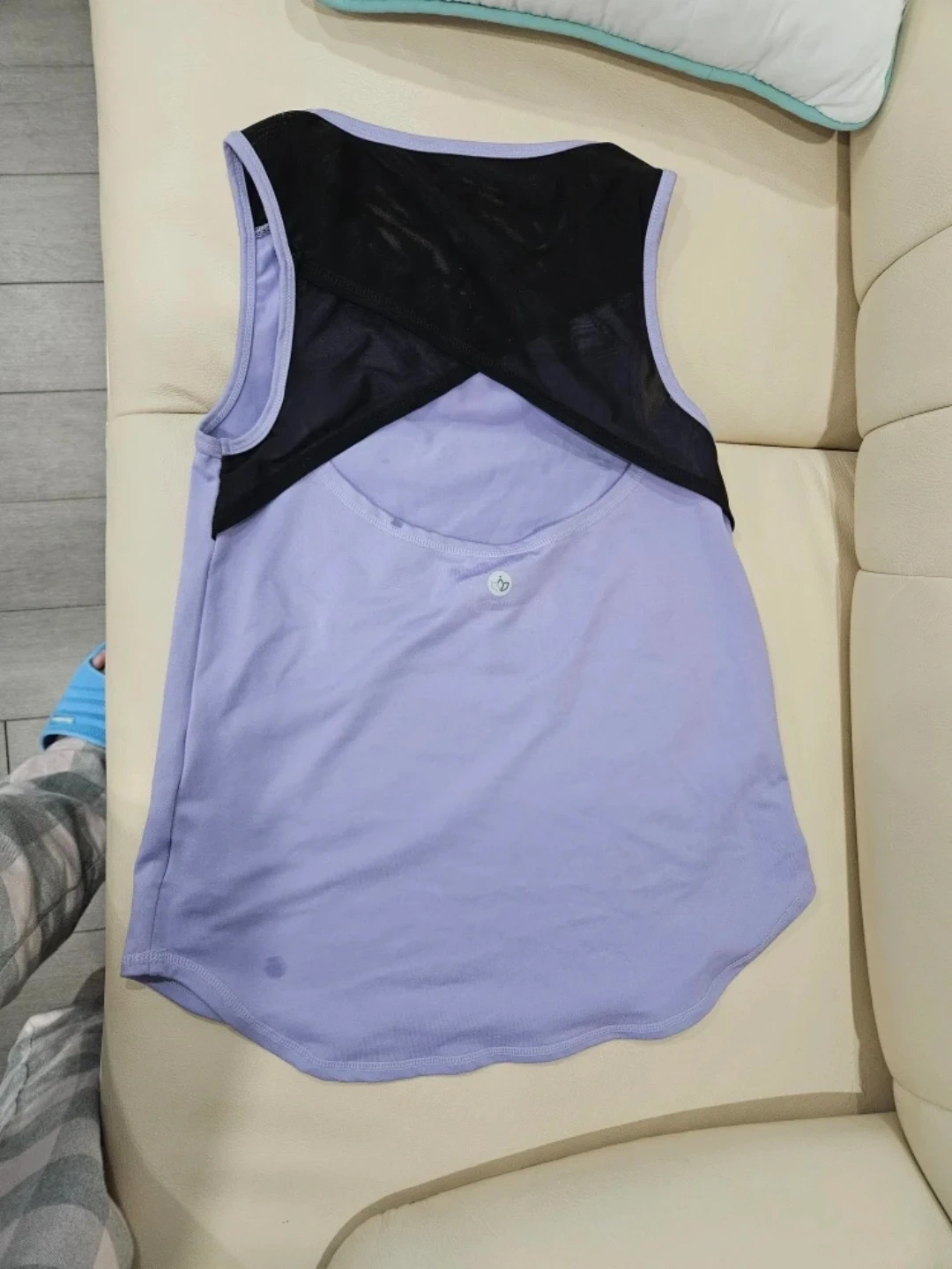 Here's a cute tank top in a lovely shade of purple! It features a stylish black mesh design on the upper back. Perfect for workouts or casual wear!