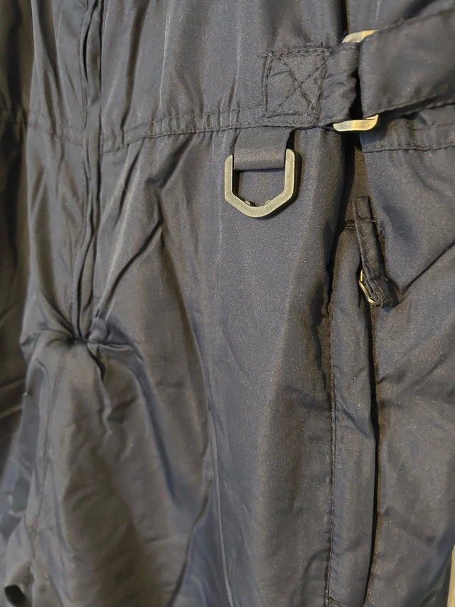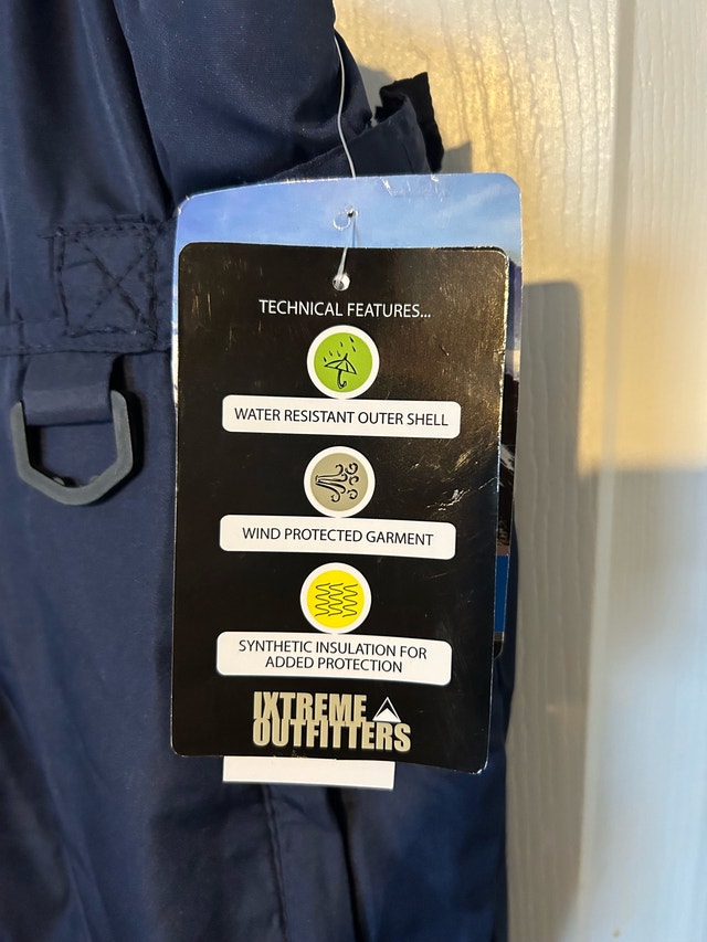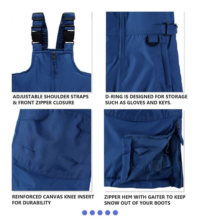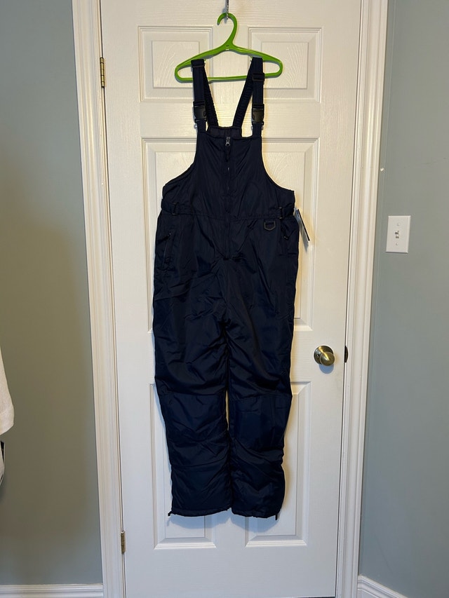 Insulated snow bib overalls designed for our cold weather. It features: • Adjustable shoulder straps with buckles for a customizable fit • A front zipper for easy wear and removal • Elasticized sides and adjustable waist straps for better fit and flexibility • Multiple zippered pockets for secure storage • Reinforced knees and bottom hems for durability • Water-resistant or waterproof fabric to keep the wearer dry • Elastic cuffs at the leg openings to keep snow out Please see pics for sizing