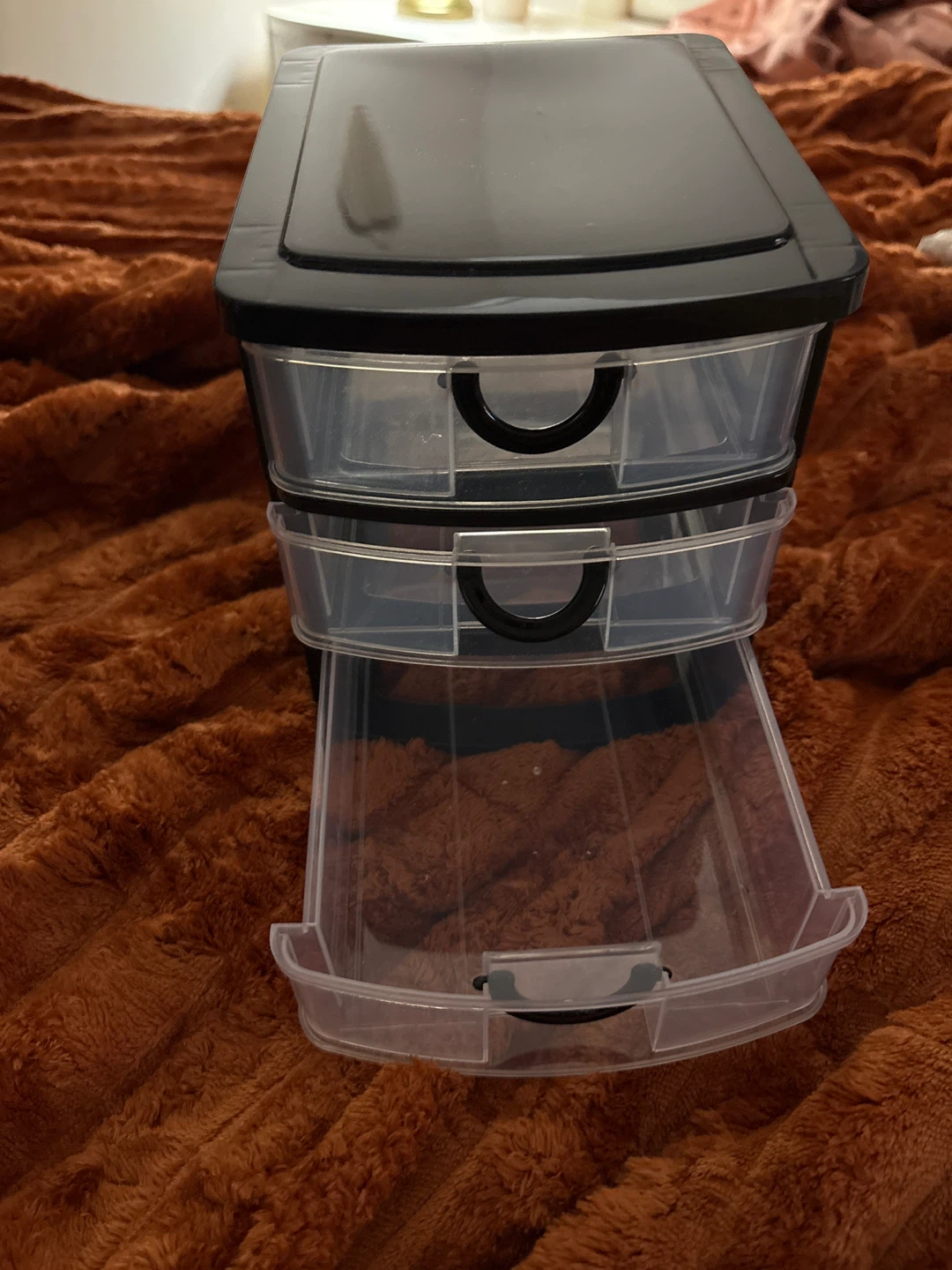 Selling a handy 3-drawer desktop organizer! It's perfect for keeping your desk neat and tidy. The drawers are clear so you can easily see what's inside, and the black frame gives it a sleek look