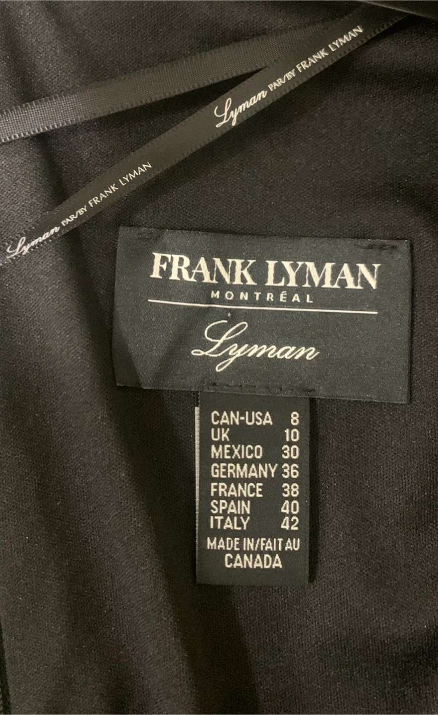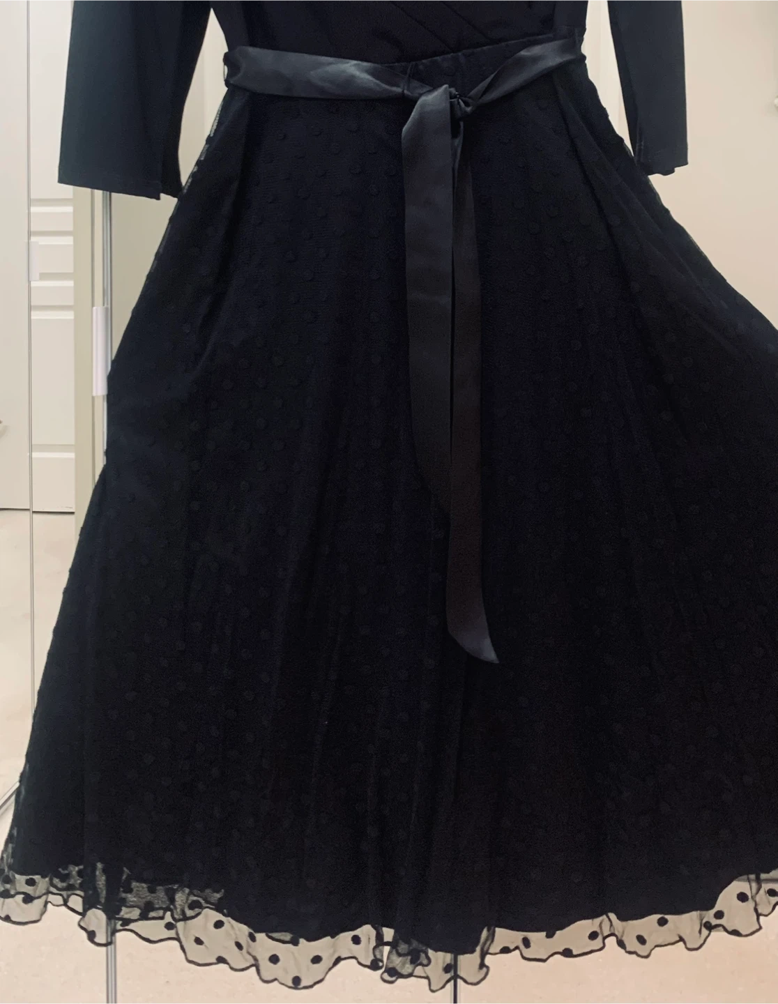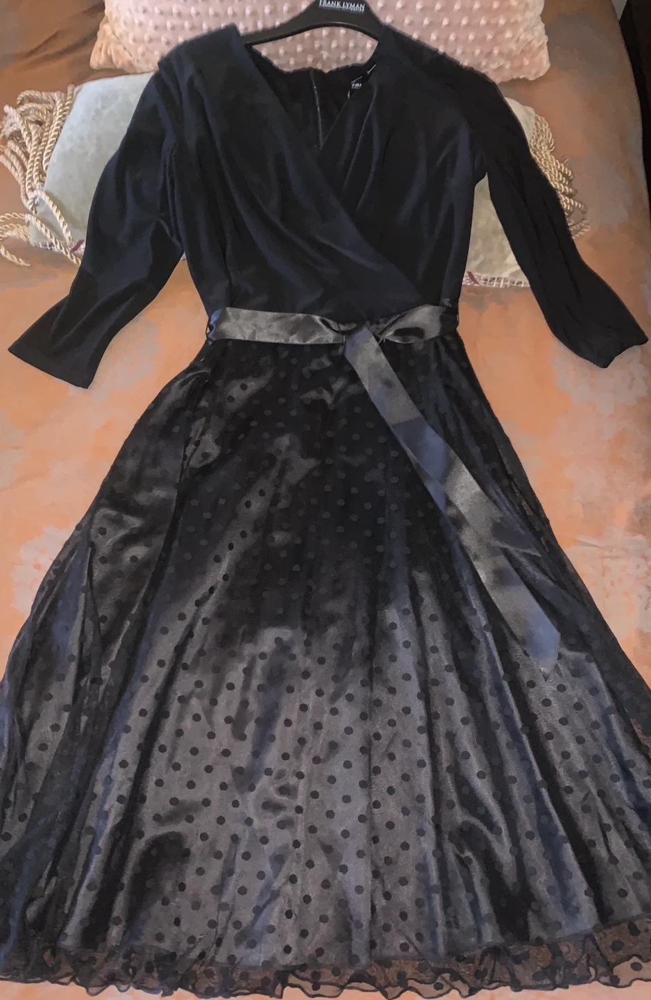 This is a lovely black dress from Frank Lyman Montreal. It's a size 8 and features a flattering wrap-style top with a tie at the waist. The skirt has a tule overlay with polka dot pattern, adding a touch of elegance. Perfect for a special occasion!