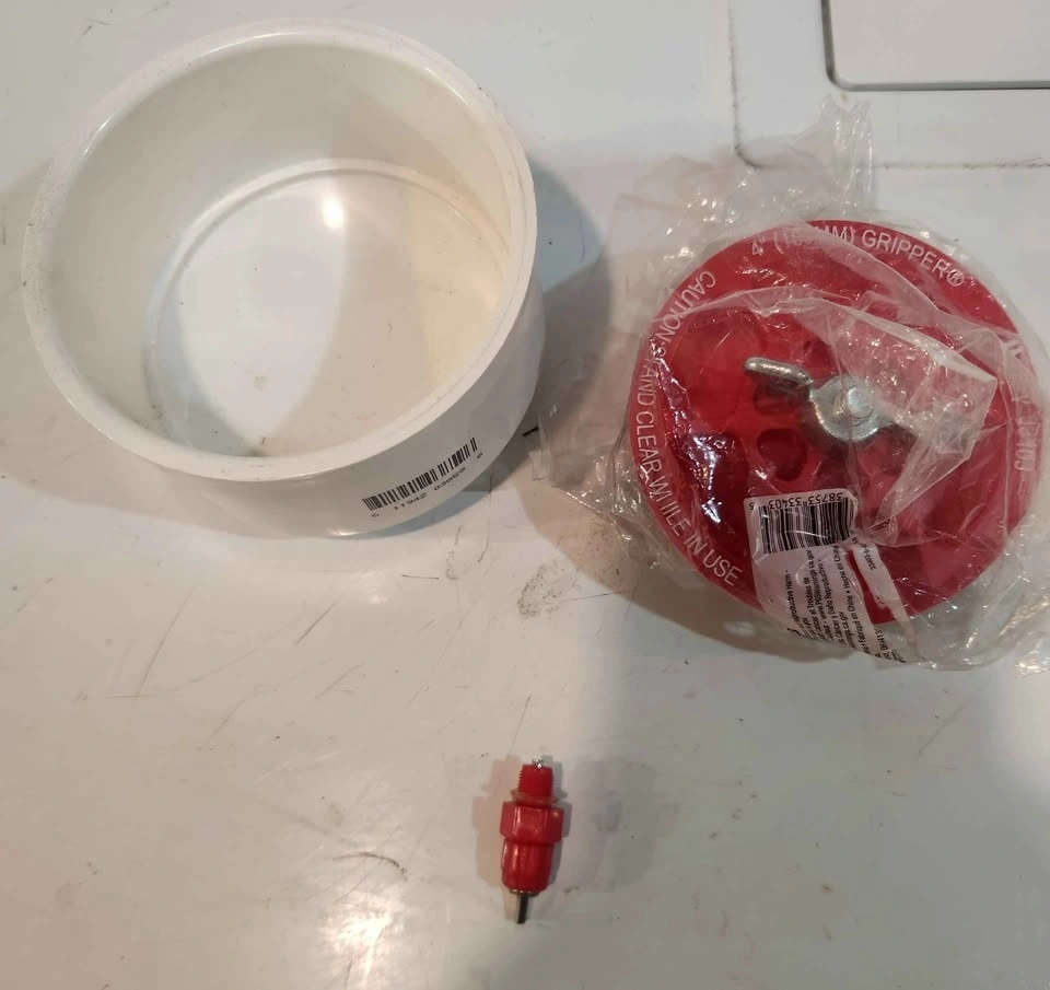 1- DIY 4" pvc pipe nipple waterer kit. (You provide the length of 4" pipe to suit your coop)(New)