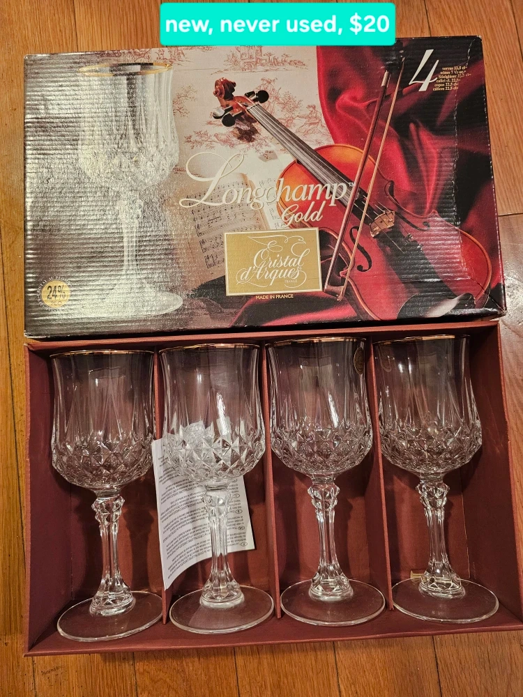 Selling a brand new set of Cristal d'Arques Longchamp Gold wine glasses! This set includes four glasses with a beautiful gold trim. They come in their original box and were originally bought for $30