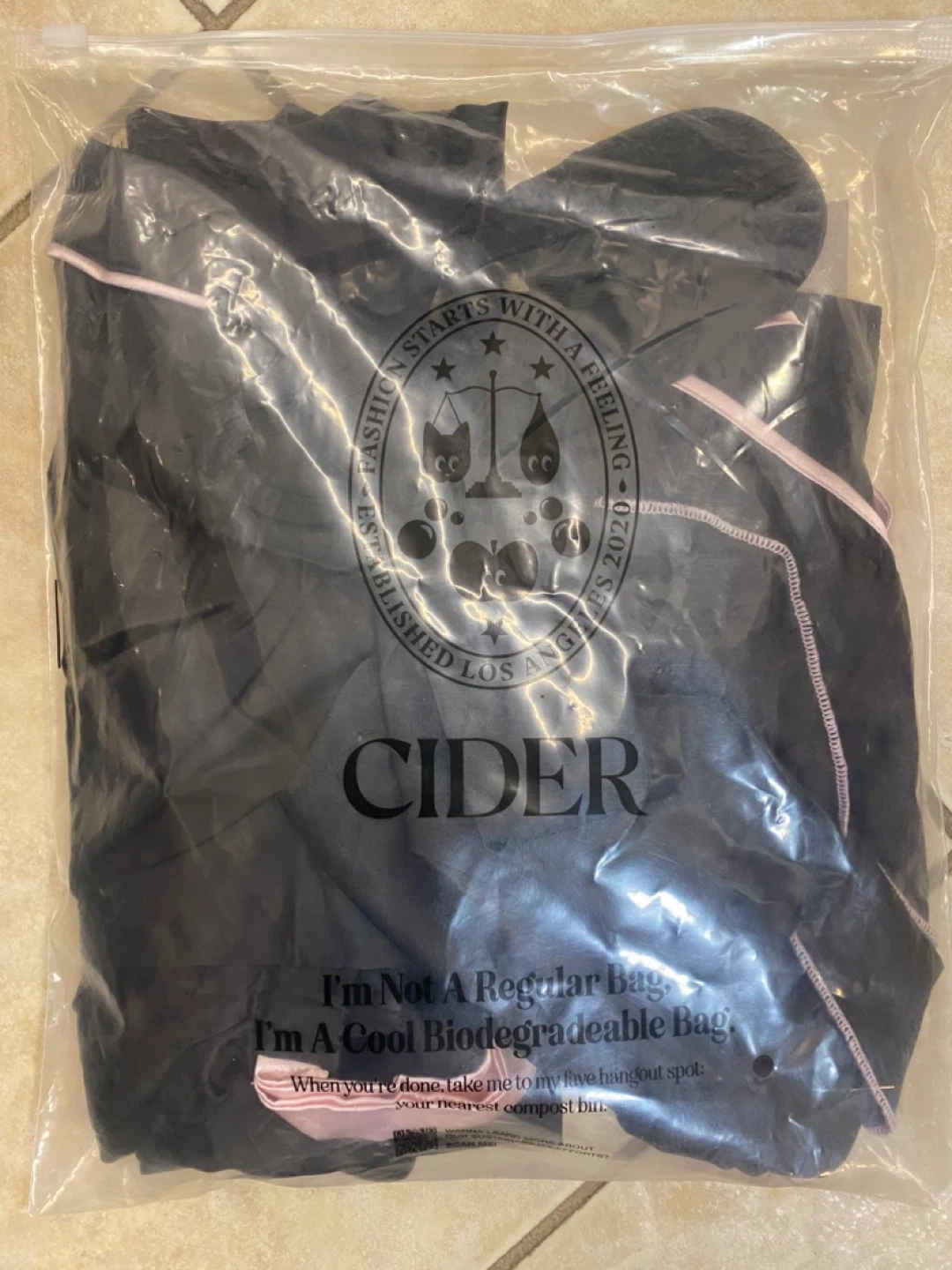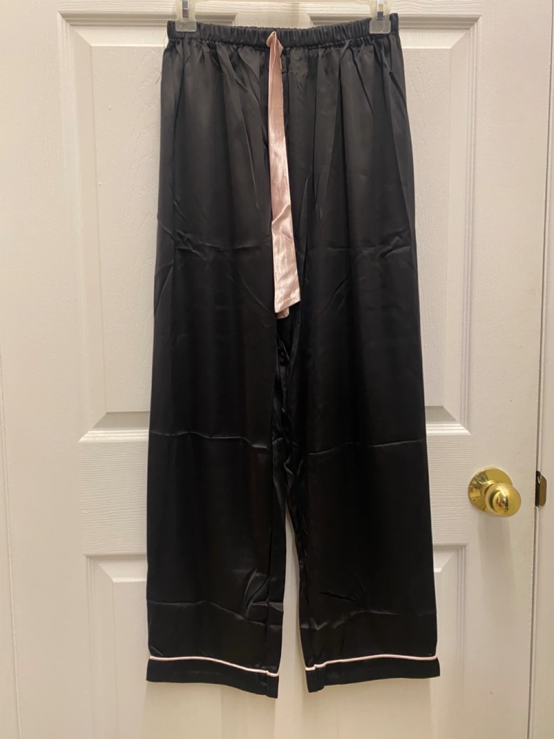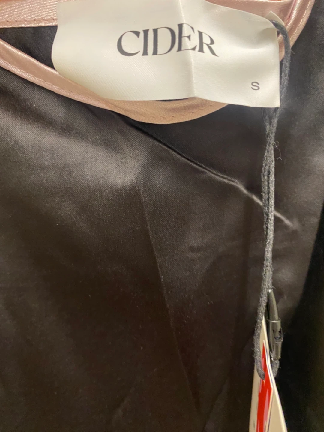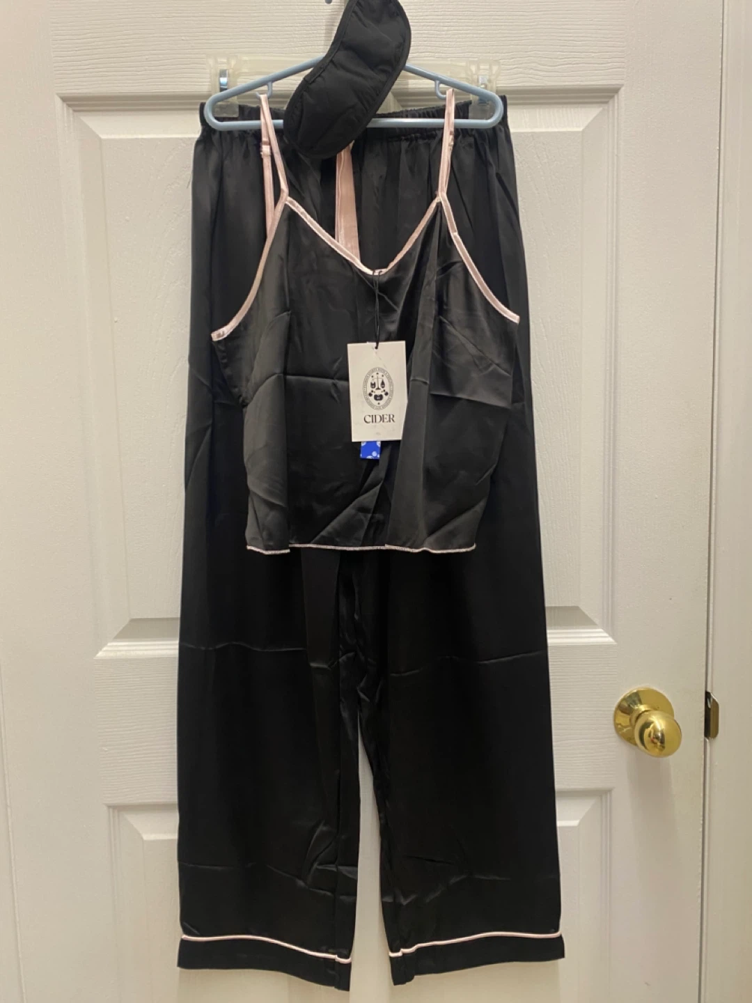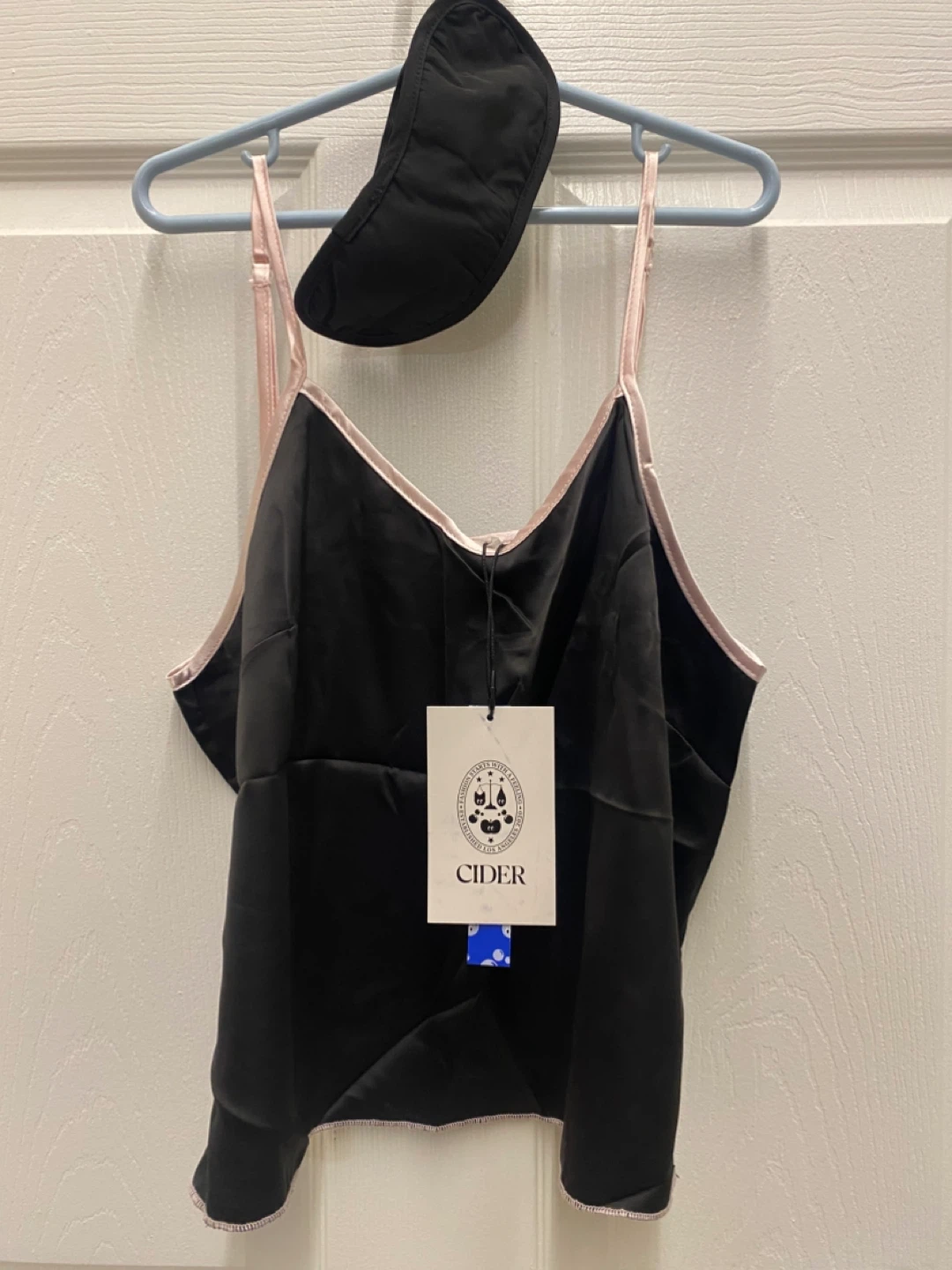 This is a brand new Cider lounge set! It's satiny, black with pink trim , and includes a cami top, pants, and an eye mask. Size small and still in the original packaging. Never been worn.