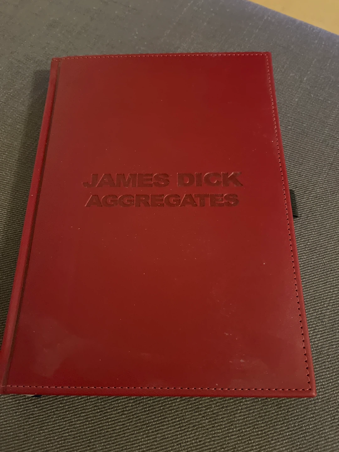 Free notebook with a red cover. The cover has the words 'JAMES DICK AGGREGATES' embossed on it. Inside, the pages are lined and ready to be filled with your notes or ideas