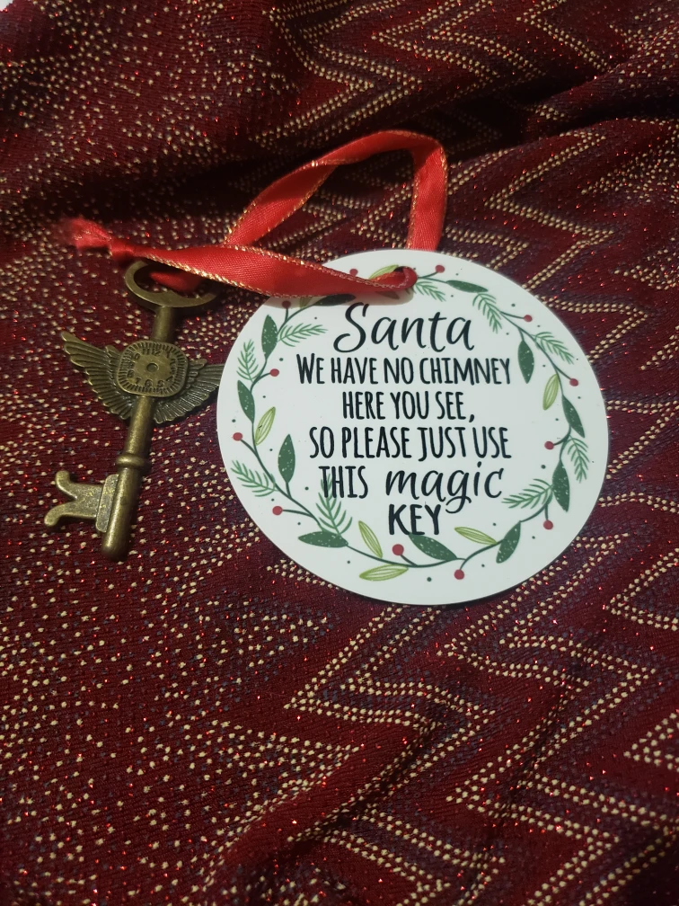 Here's a cute Christmas ornament with a magic key! The ornament has a festive design with reindeer and trees. It says, "Santa, we have no chimney here you see, so please just use this magic key"