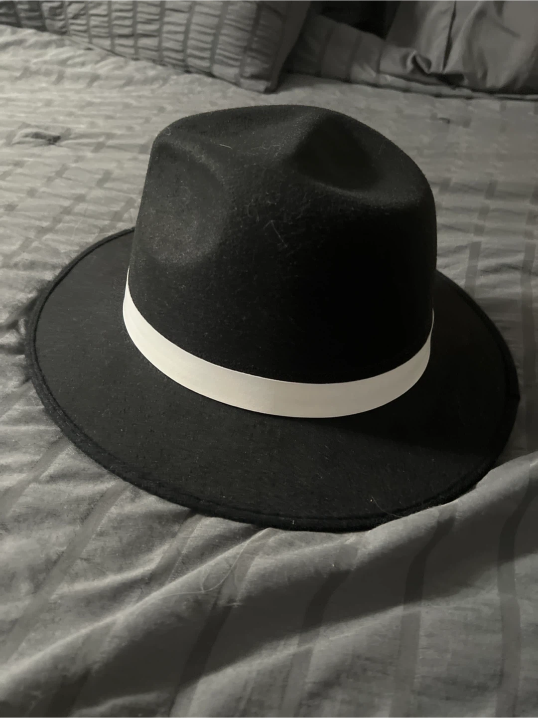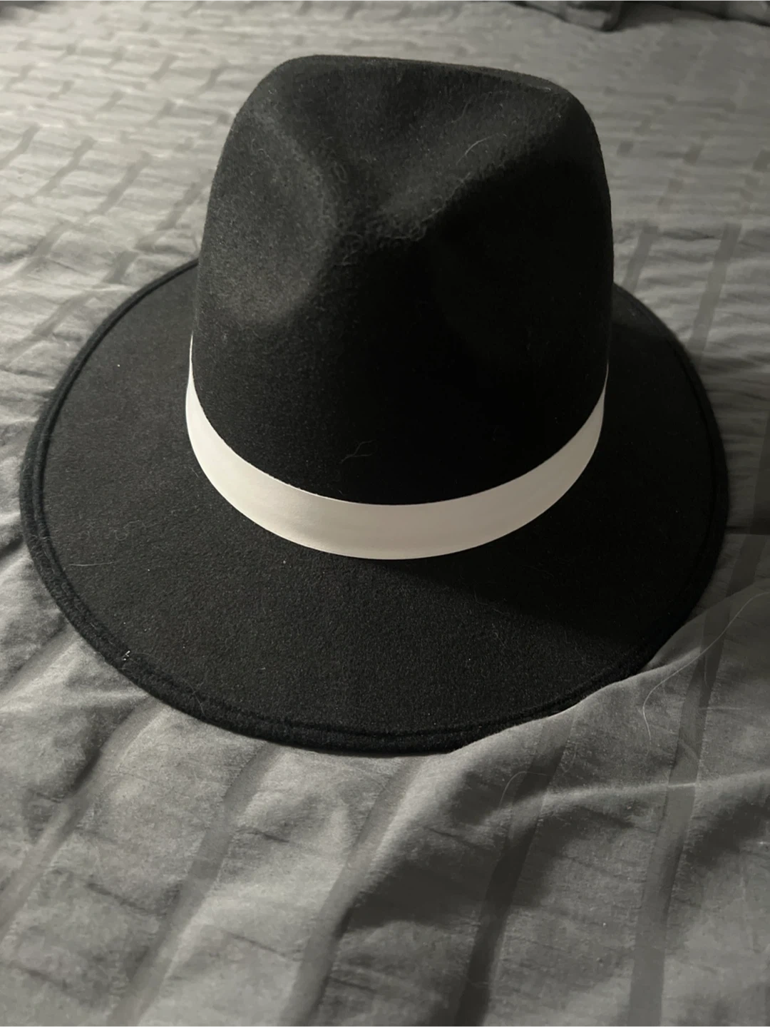 Selling a stylish black fedora hat. It features a clean white band around the base of the crown. It's in good condition and ready to add a touch of class to your wardrobe!