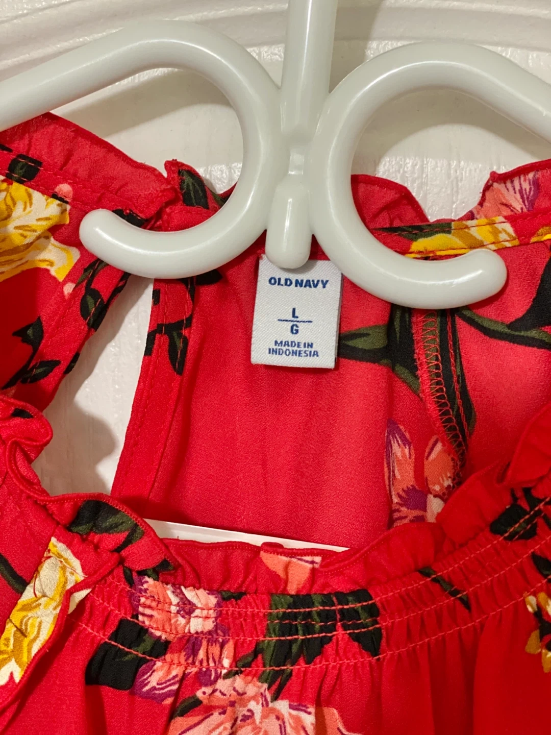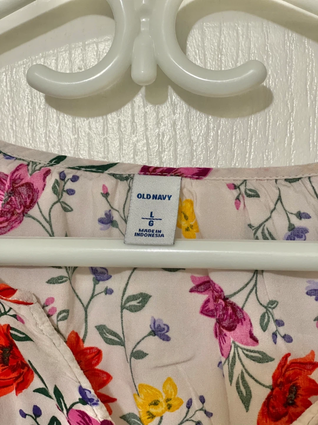 Selling a set of Old Navy floral blouses in size large. There's a red floral print, a white floral print, and a black floral print. All are in great condition!