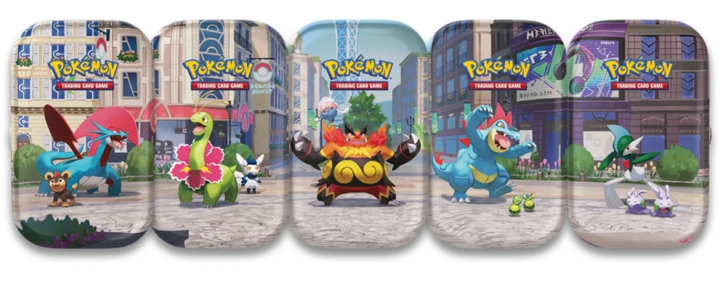 This set includes five Pokémon Trading Card Game tins. Each tin features a unique Pokémon design and artwork. They're great for storing your cards!