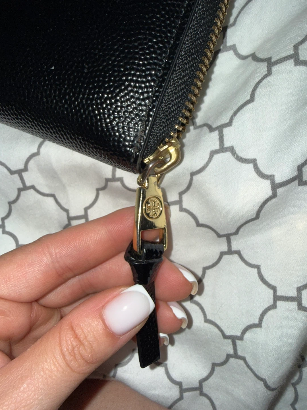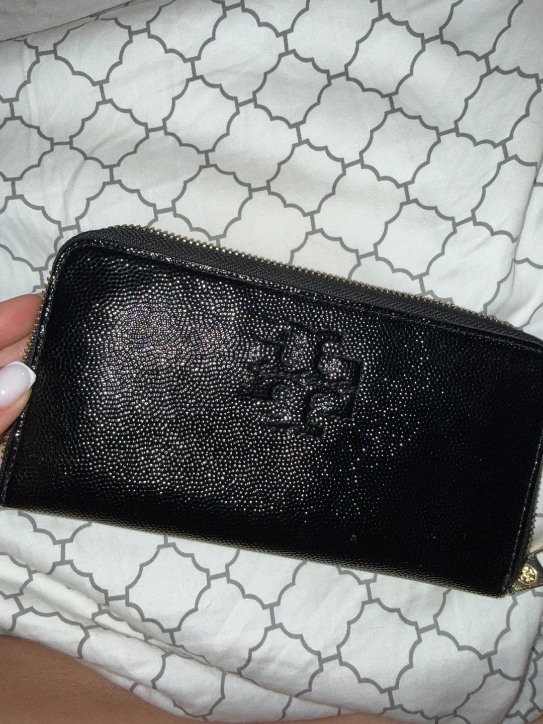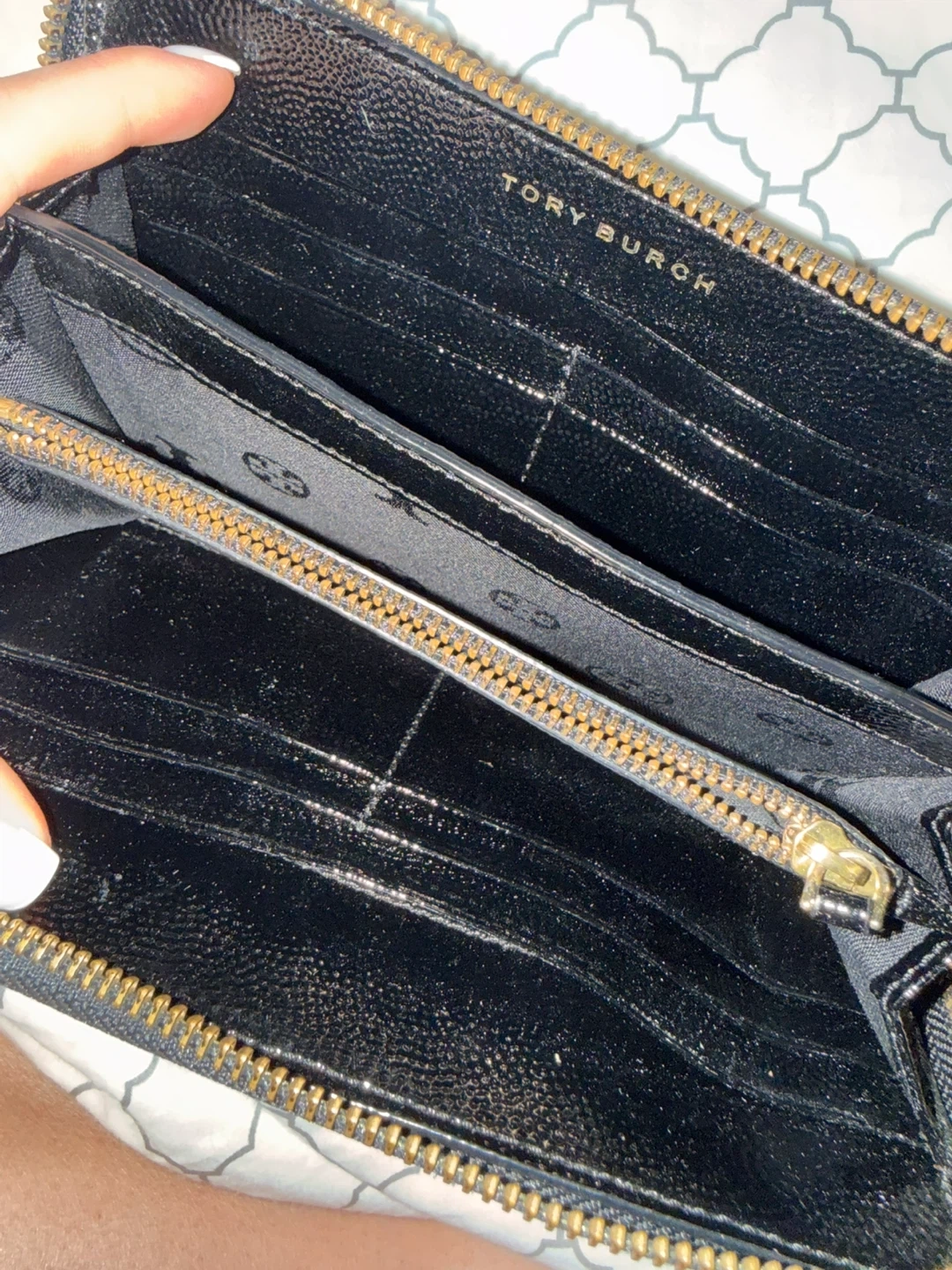 This is a black leather zip-around wallet by Tory Burch. It has multiple card slots and zippered compartments inside. The exterior features the signature Tory Burch logo embossed.