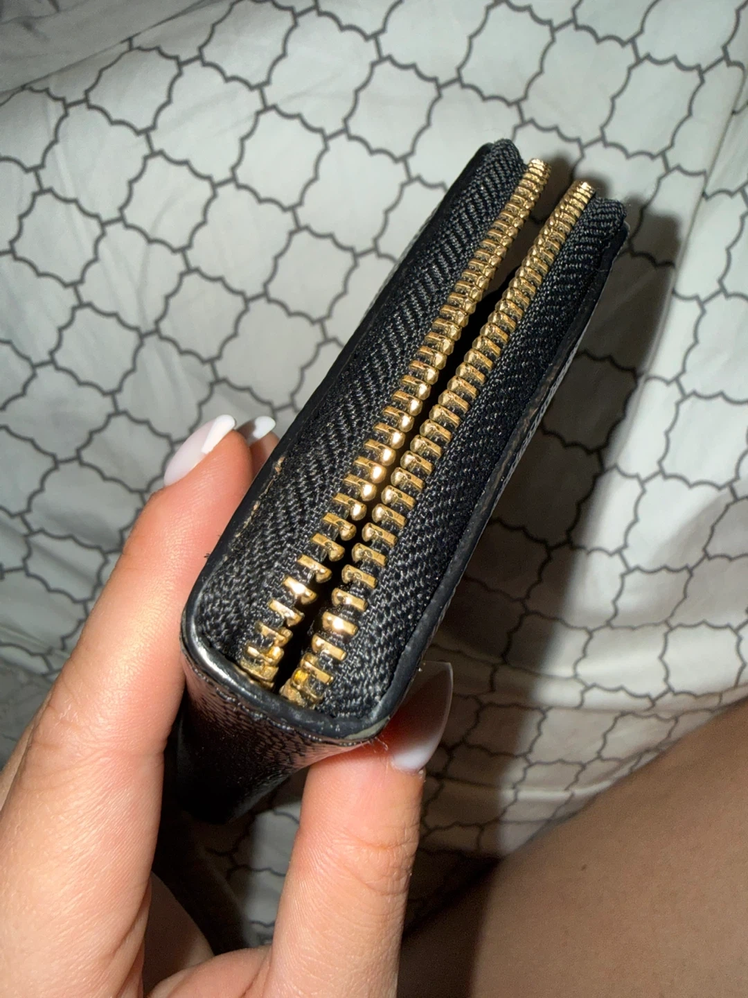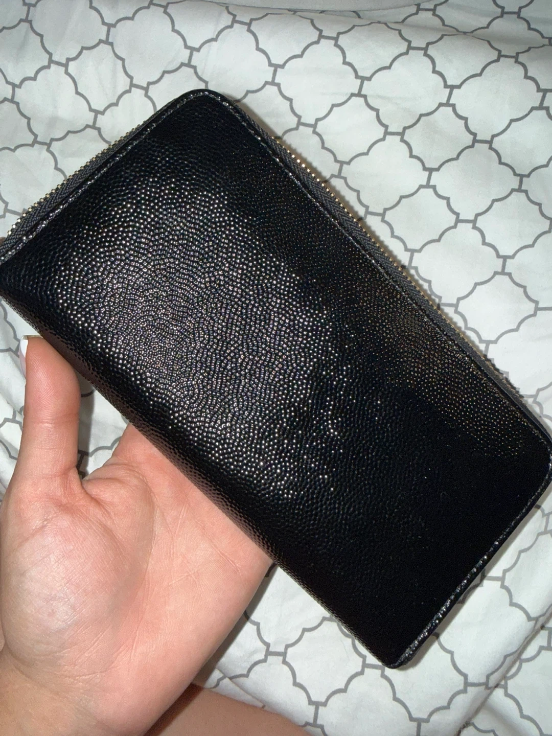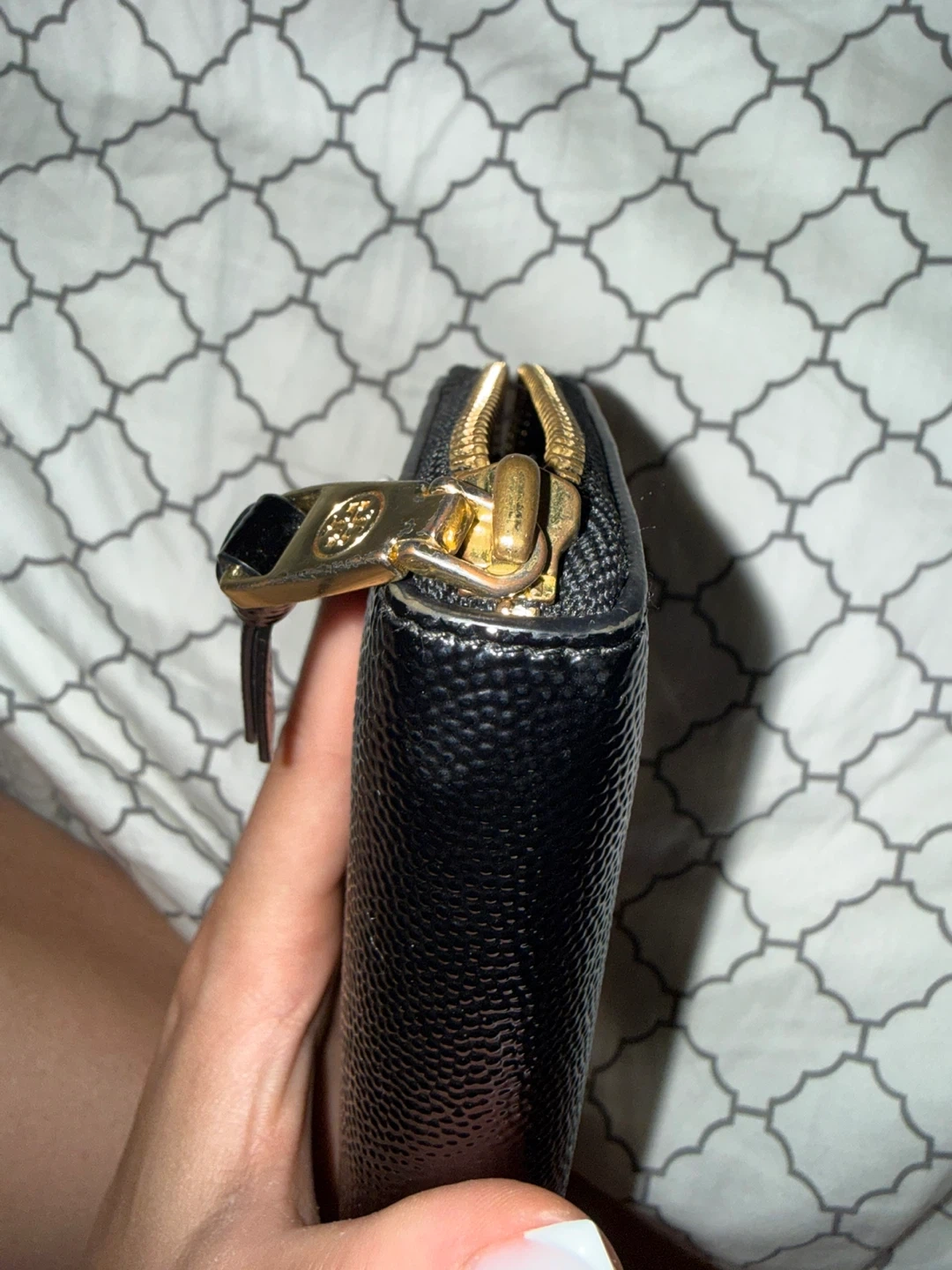 This is a black leather zip-around wallet by Tory Burch. It has multiple card slots and zippered compartments inside. The exterior features the signature Tory Burch logo embossed.
