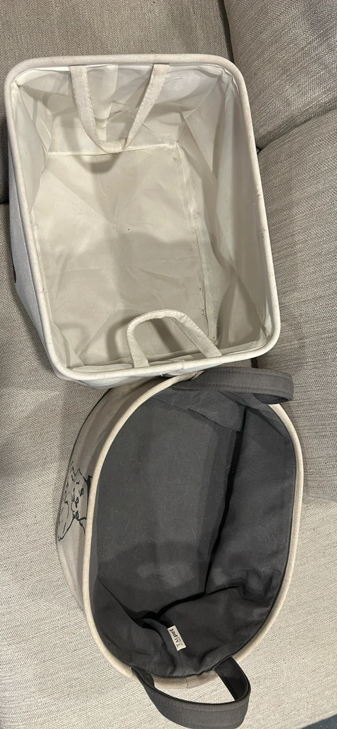 Here's a set of two cute storage baskets for your dog's stuff! One has a silhouette of a dog and says "Dog Stuff" and the other has a French Bulldog wearing a beret. They're both in great condition and ready to organize your pet's toys and accessories