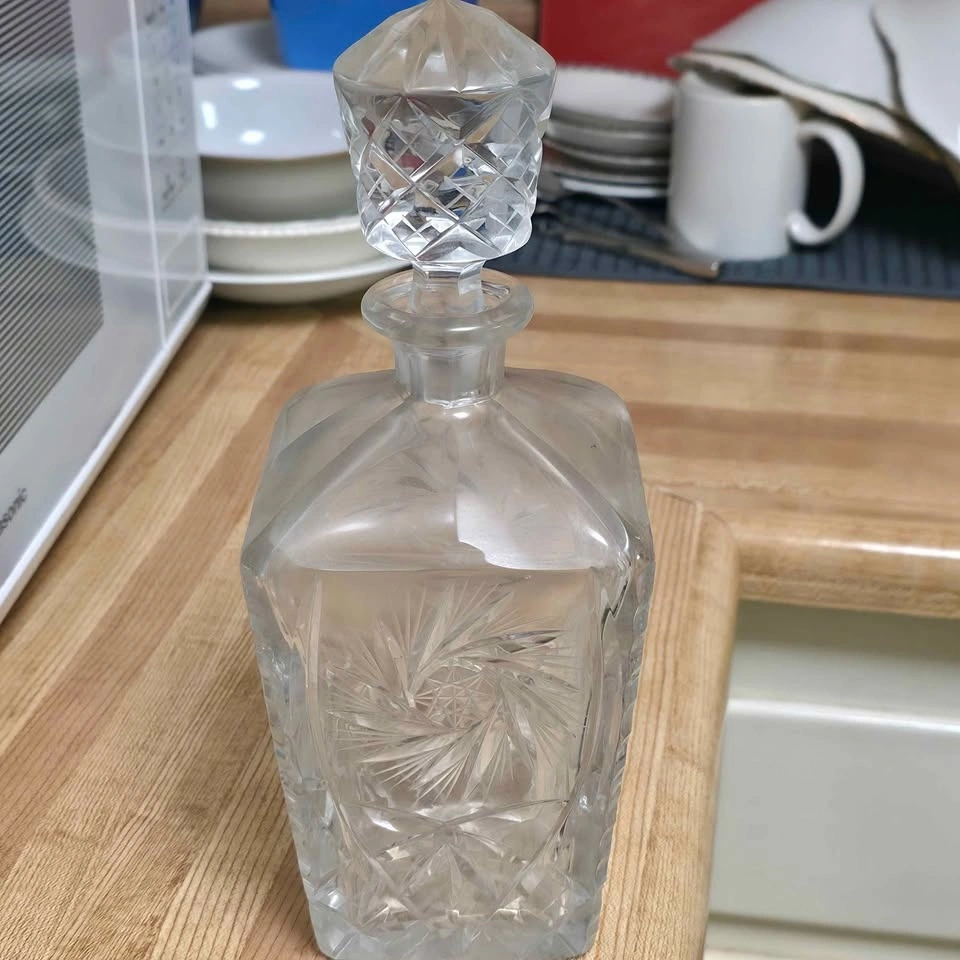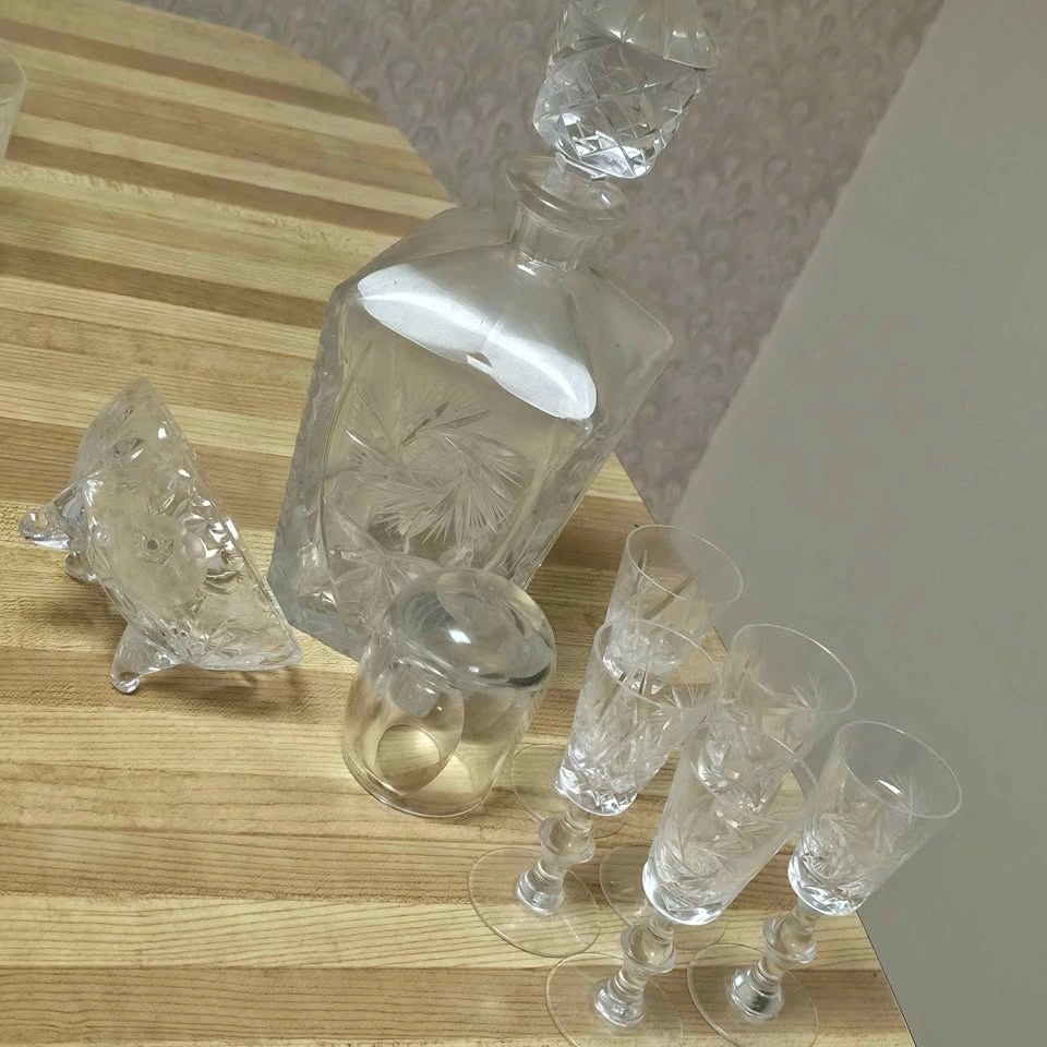 Each piece is an original, bearing the charm and character of its time. The decanter comes with a matching stopper, along with an additional top, ensuring your spirits are kept secure and fresh. The set is perfect for those who appreciate the beauty of elegant glass production styles and value the unique artistry of vintage collectibles. Hand wash only care will preserve the intricate engravings and decorations for years to come.