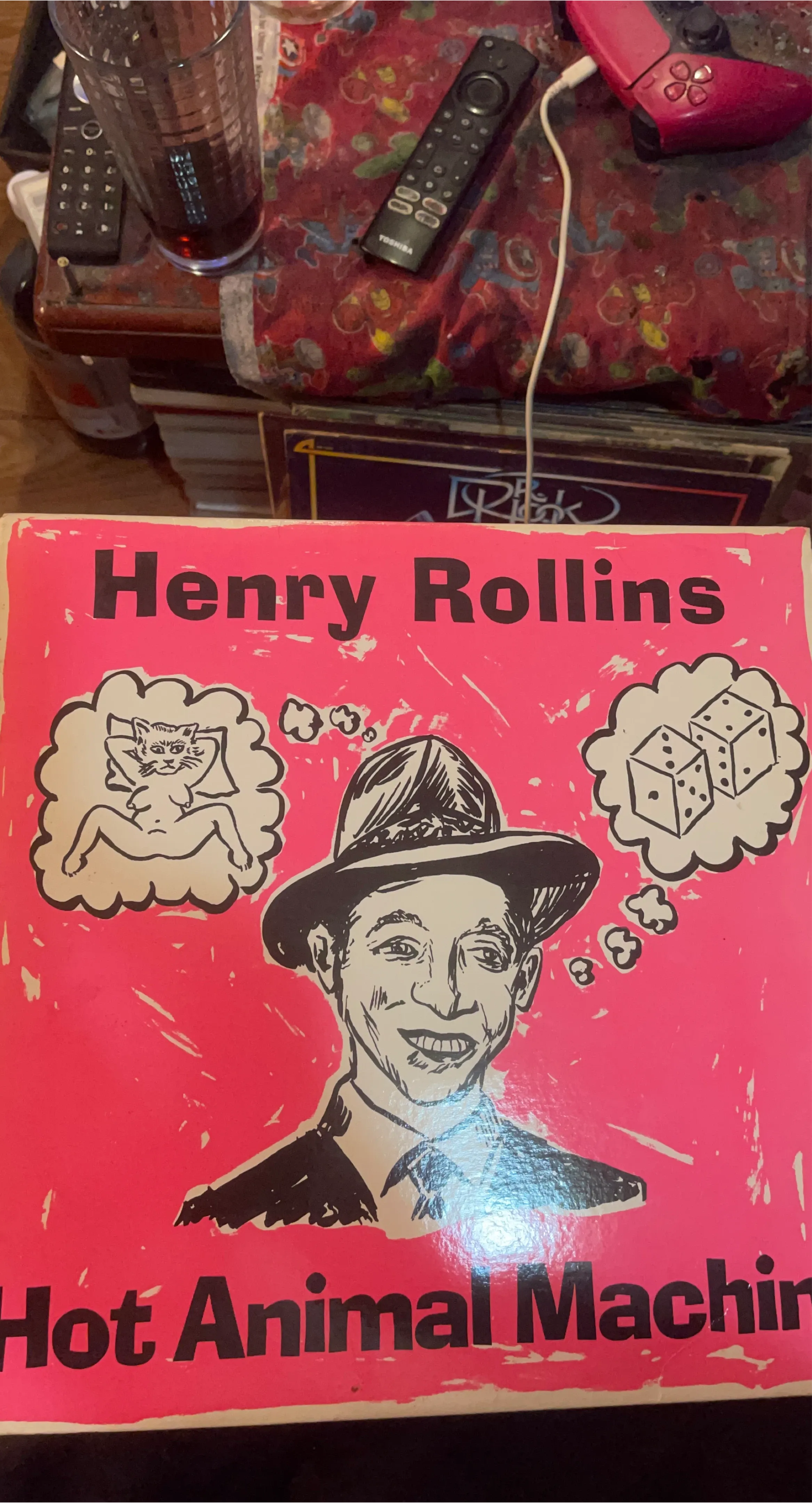 Selling a Henry Rollins vinyl record, titled 'Hot Animal Machine'! The cover is pink with black and white illustrations. It's a great addition for any vinyl collector or Henry Rollins fan