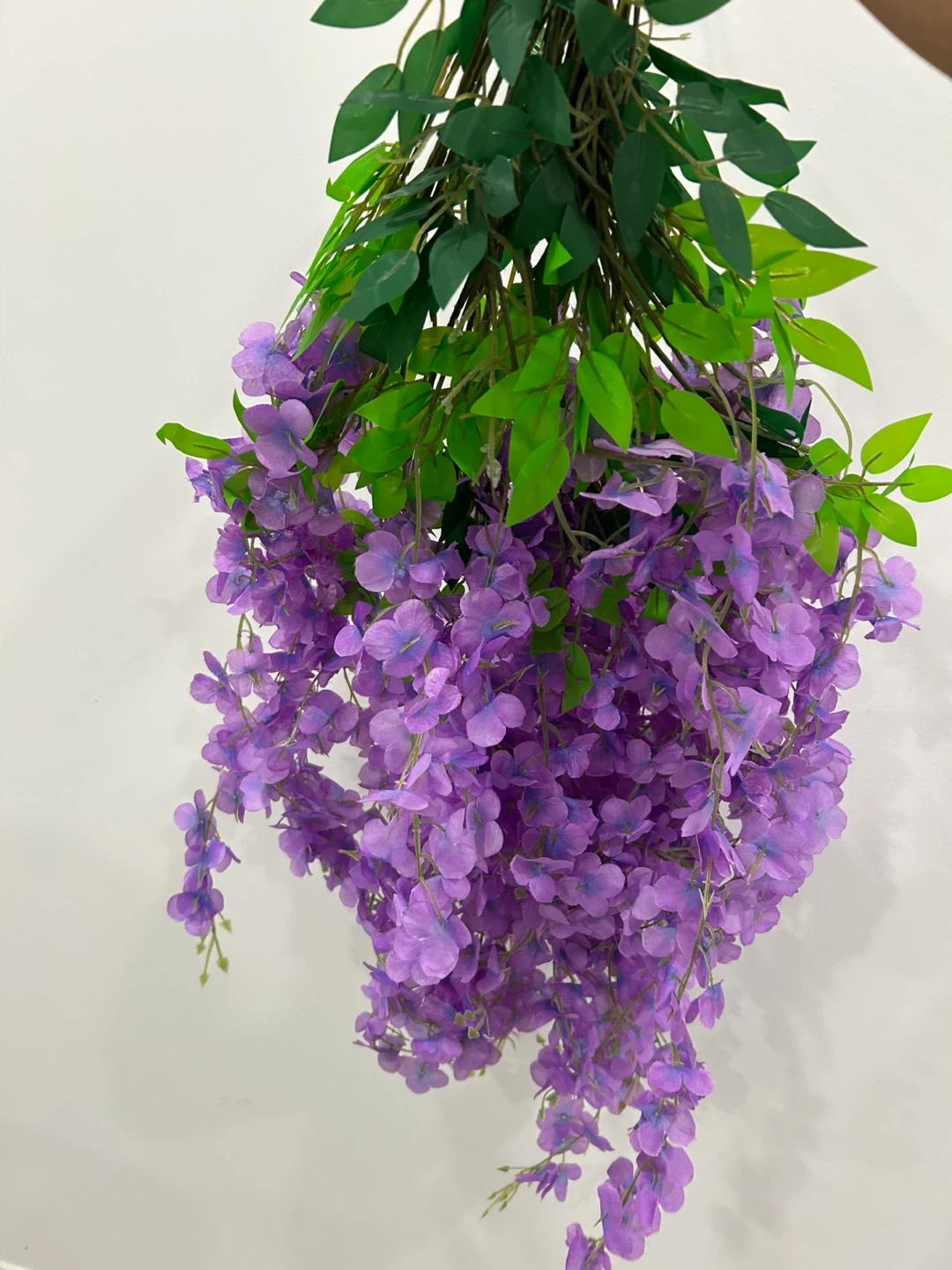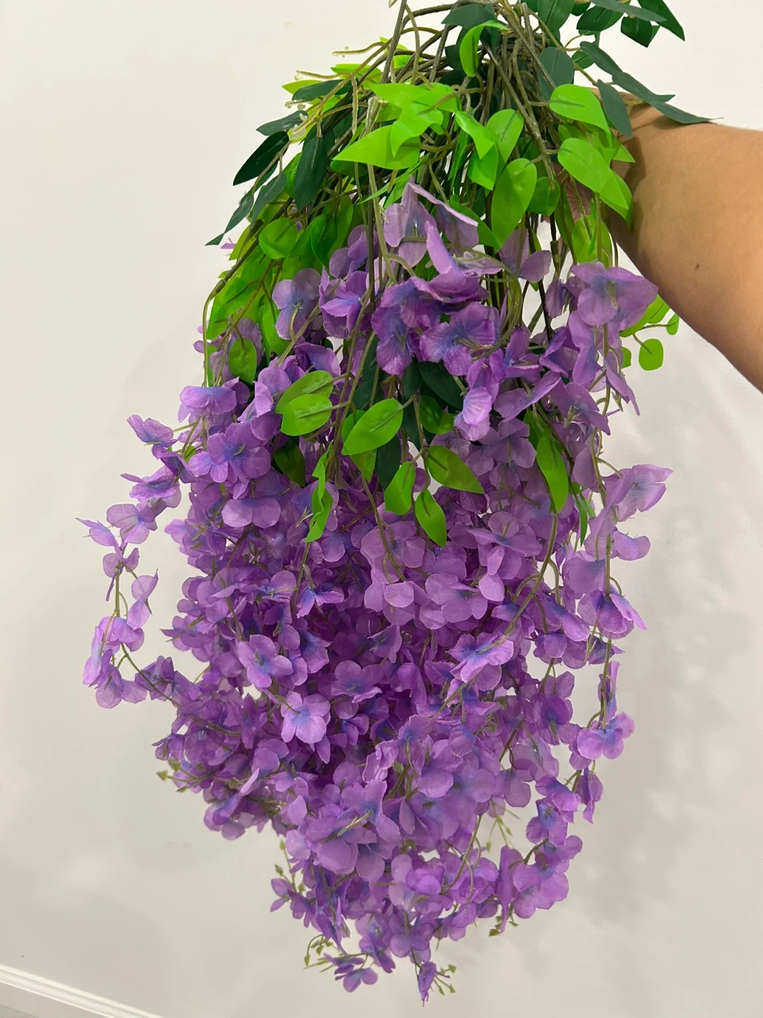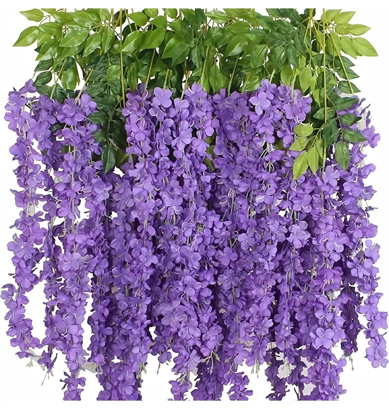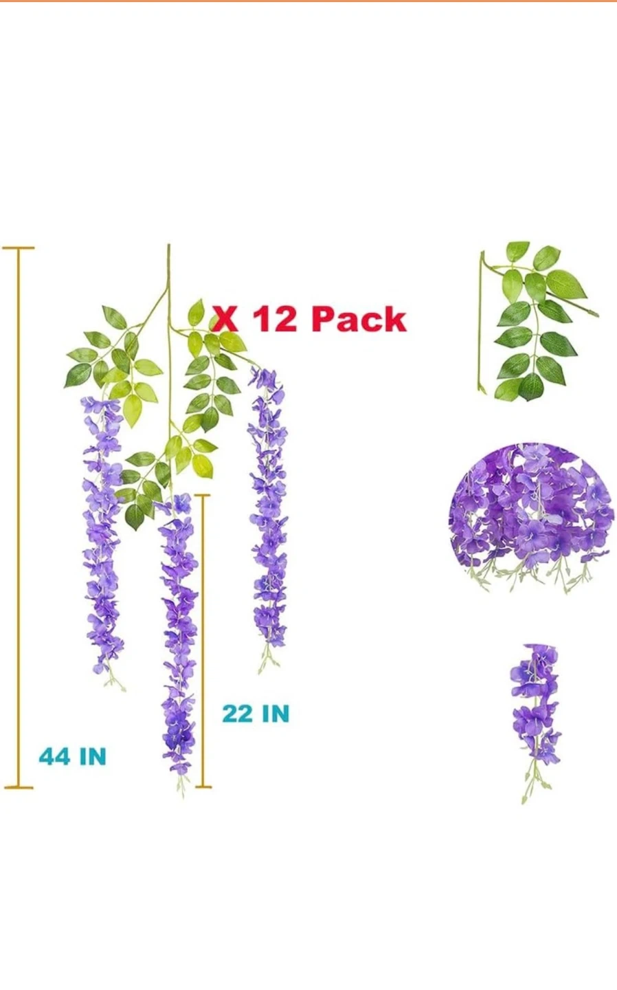 Selling a 12 pack of artificial wisteria hanging flowers. Each strand is 44 inches long, with the flower portion measuring 22 inches. They're a beautiful purple color and perfect for adding a touch of floral elegance to any space. 6 packs are available each selling for $15.00