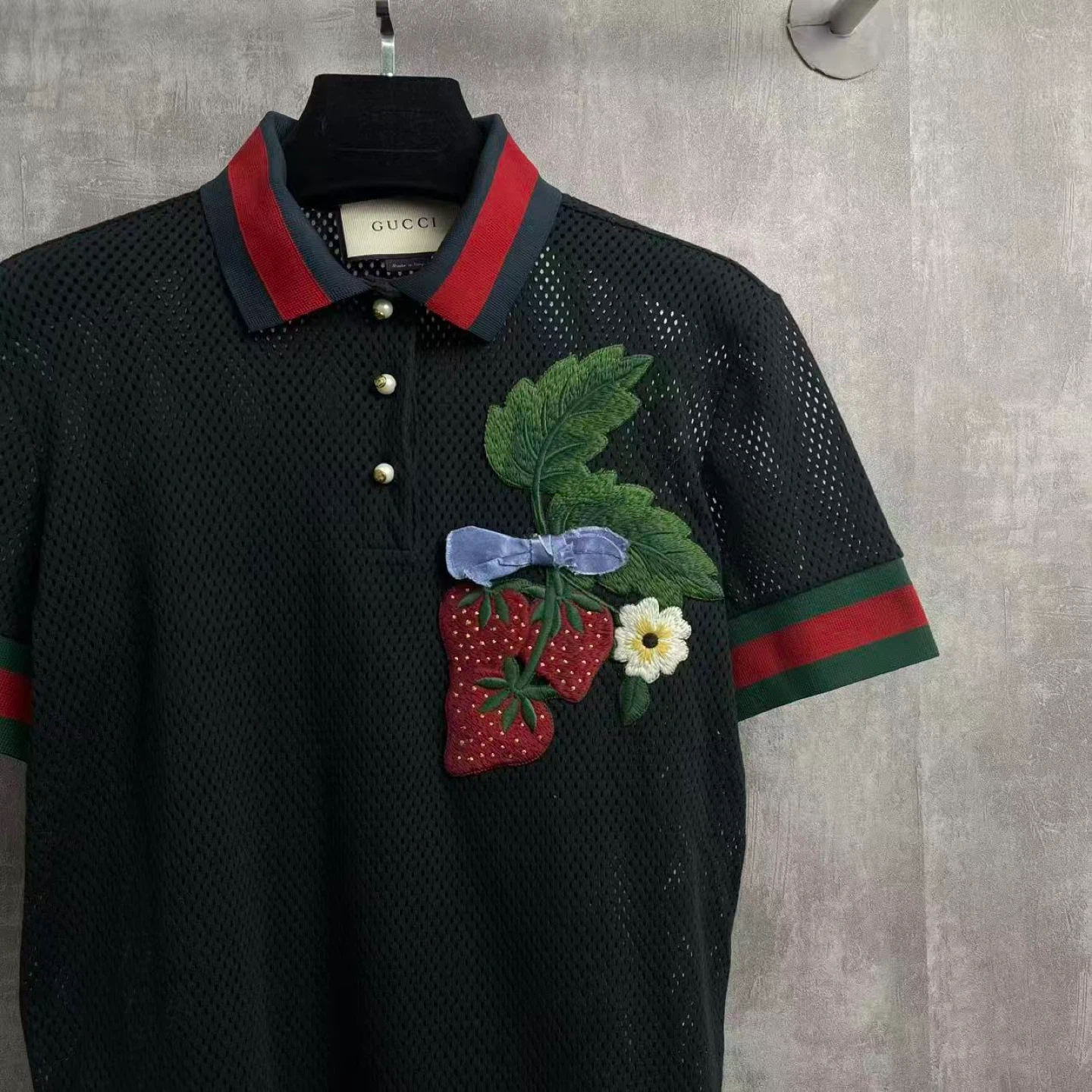 This is a stylish Gucci polo shirt featuring a unique strawberry design. The shirt is black with the classic Gucci green and red stripes on the sleeves and collar. It's a fashionable piece that would make a great addition to your wardrobe!