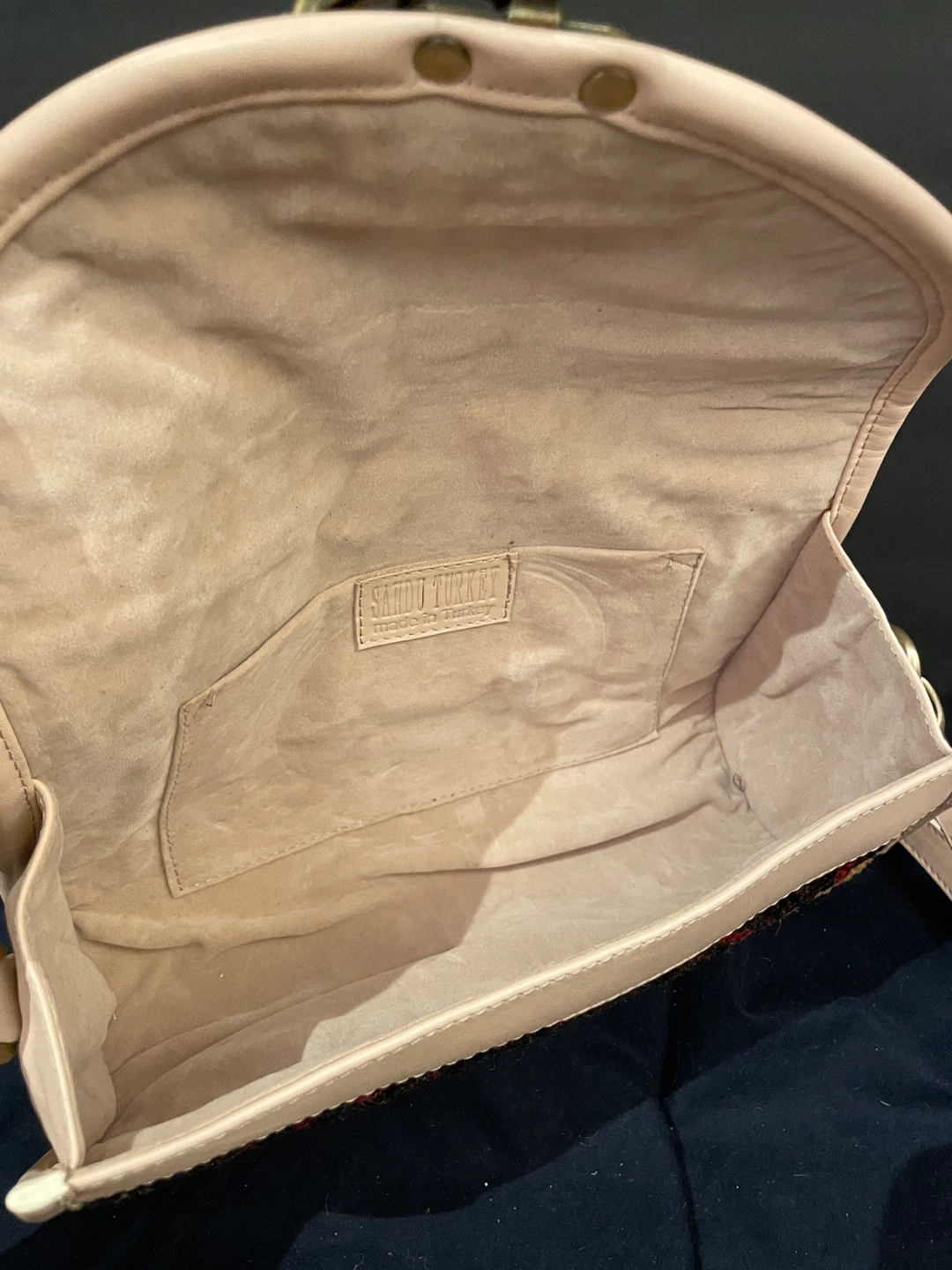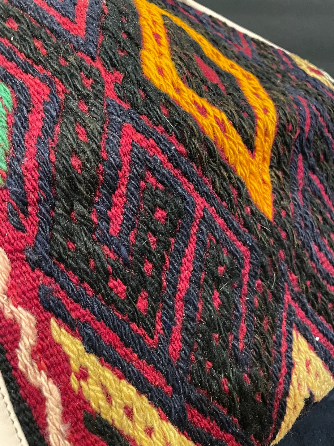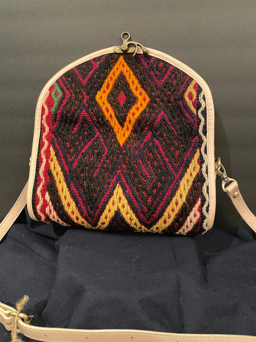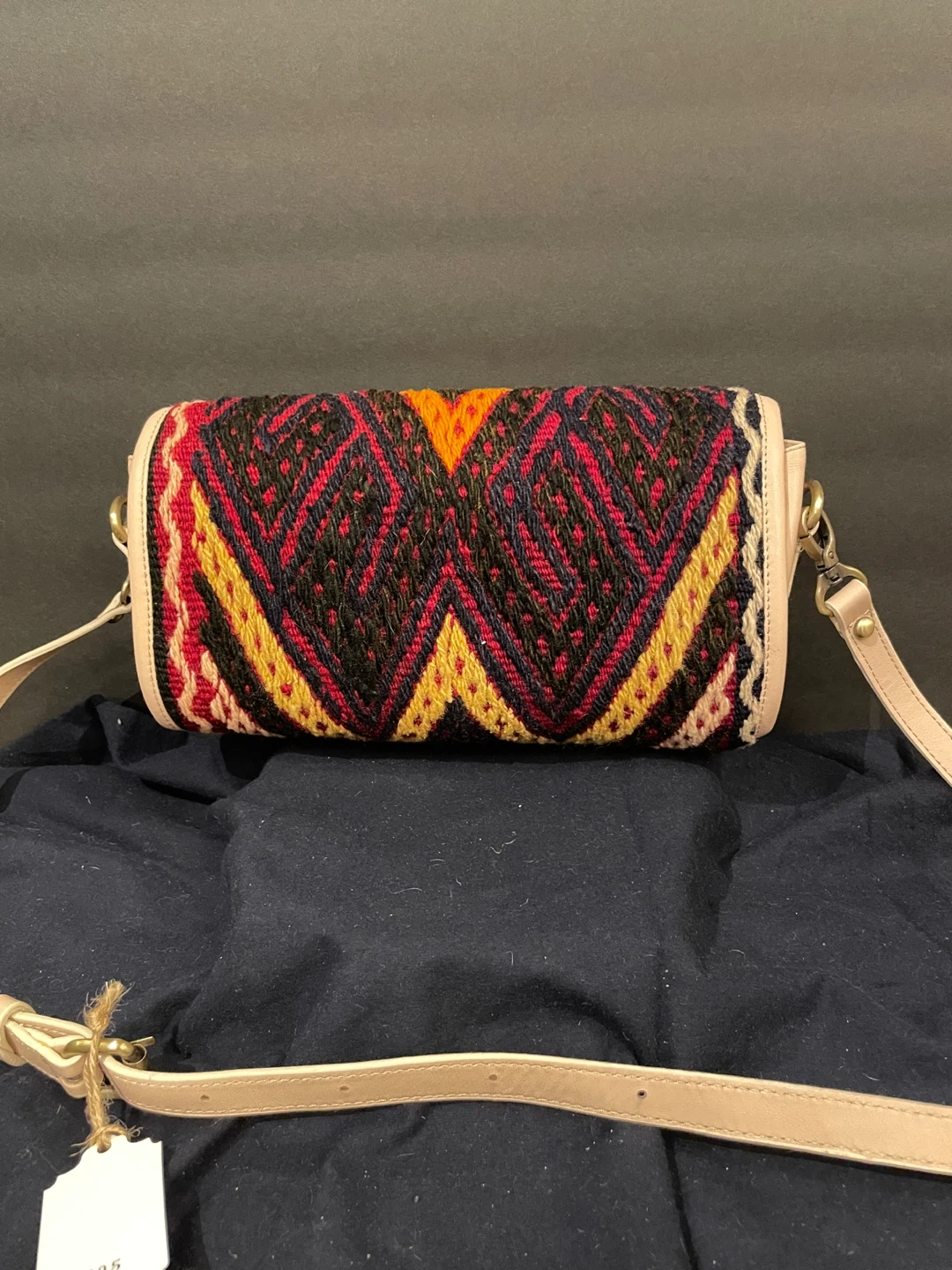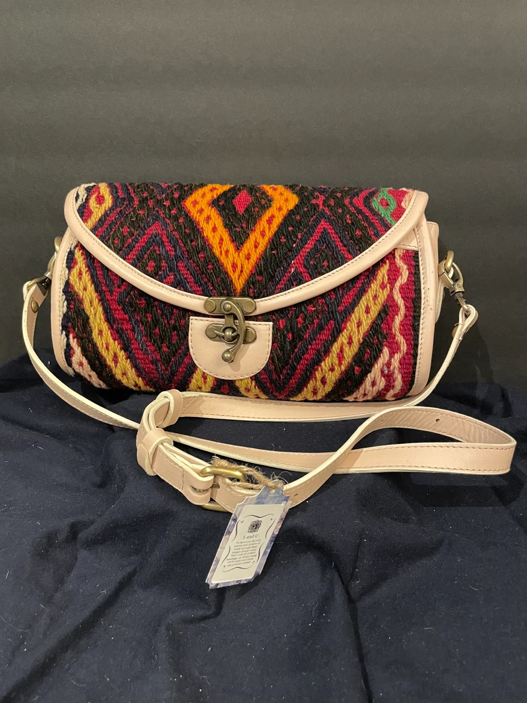 This is a beautiful woven crossbody bag from SANDU TURKEY! The bag features a unique geometric pattern with colors of red, yellow, black, and orange. It has a light pink trim and strap. The interior is lined with suede. This will be a great light color bag for Spring.
