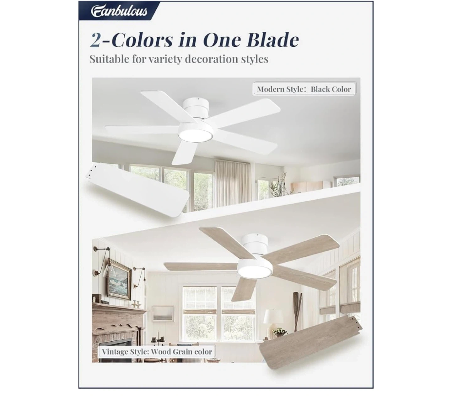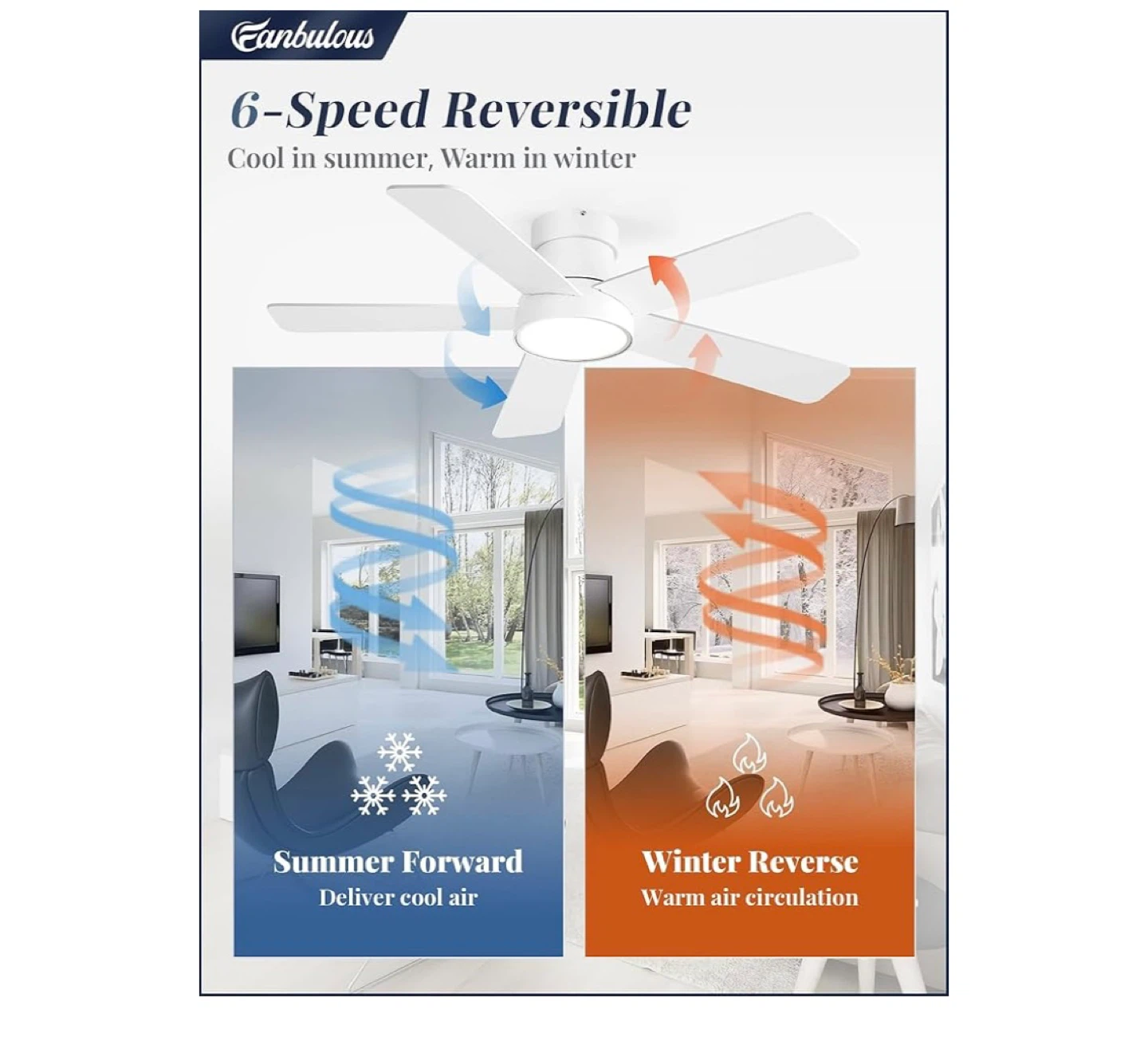 Selling a Fanbulous 42 inch ceiling fan! It has 6 speeds and is reversible, so it can cool in the summer and warm in the winter. The blades are 2-colors in one: white and wood grain. It also has 3-color temperature settings to meet the light demand in different scenarios. The fan has an LED light with 3CCT and is made of engineered wood. It also comes with a remote control