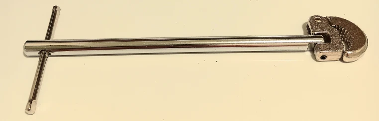 This is a used basin wrench, a plumbing tool designed for tightening or loosening nuts and fasteners in hard-to-reach places under sinks and basins, featuring a swivel head and a T-handle for better leverage.