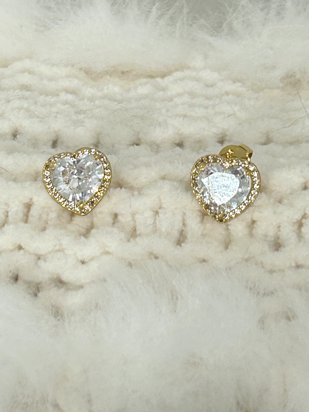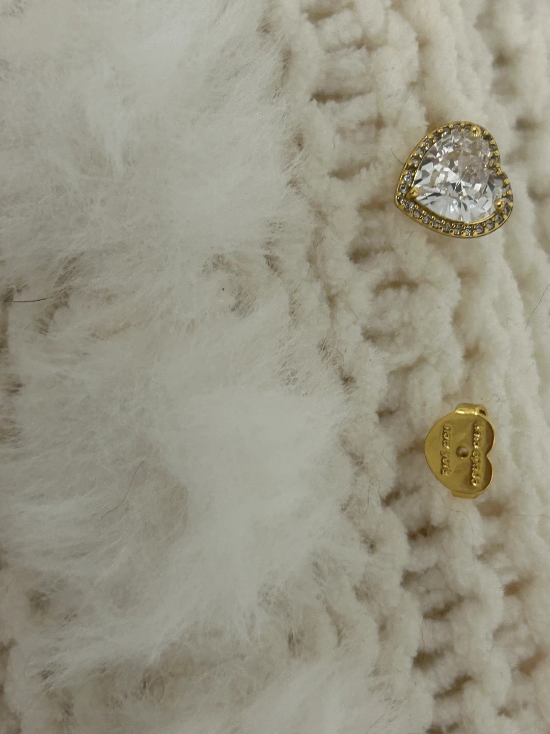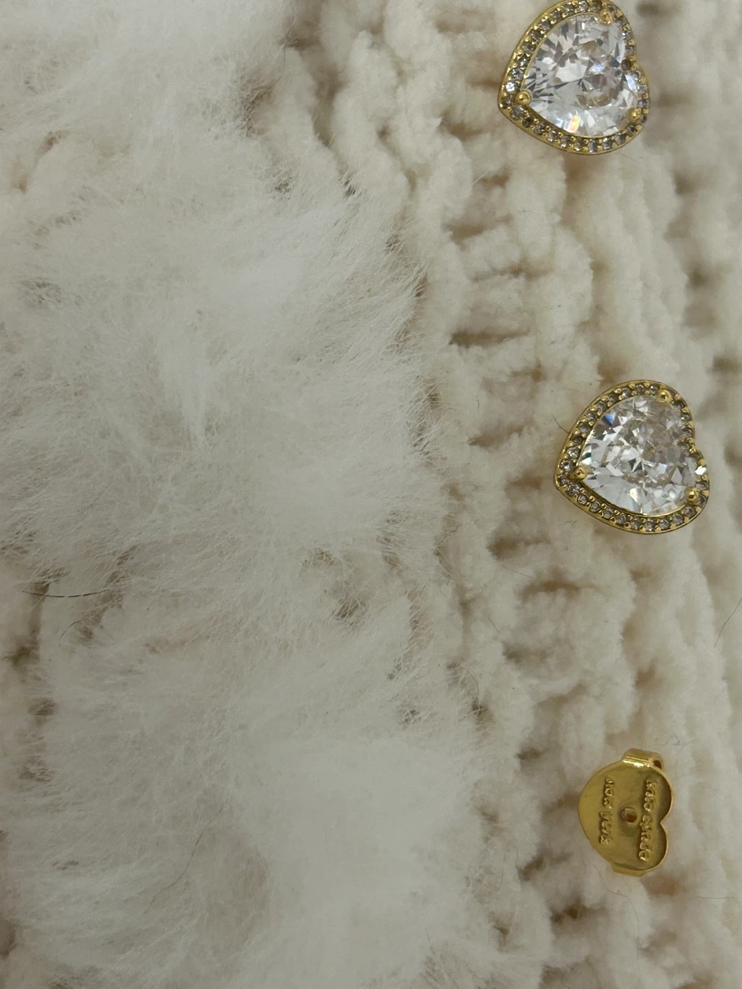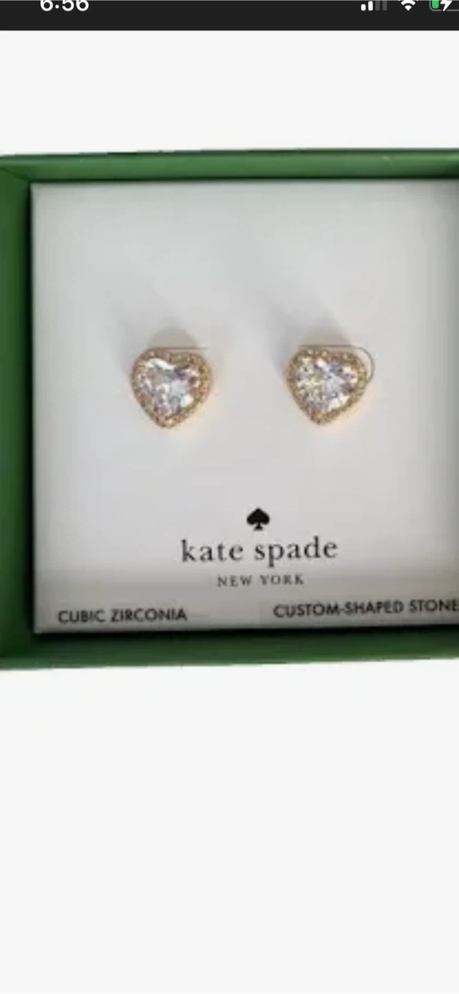 earrings from Kate Spade New York display a beautifully-hued heart halo design set in gold . These new gorgeous earrings have heart shaped backing stamped Kate spade . The pictures do no justice as they sparkle and clarity of stone in centre is stunning. Perfect for everyday or to wear for any event . Perfect for the up coming holidays as well.