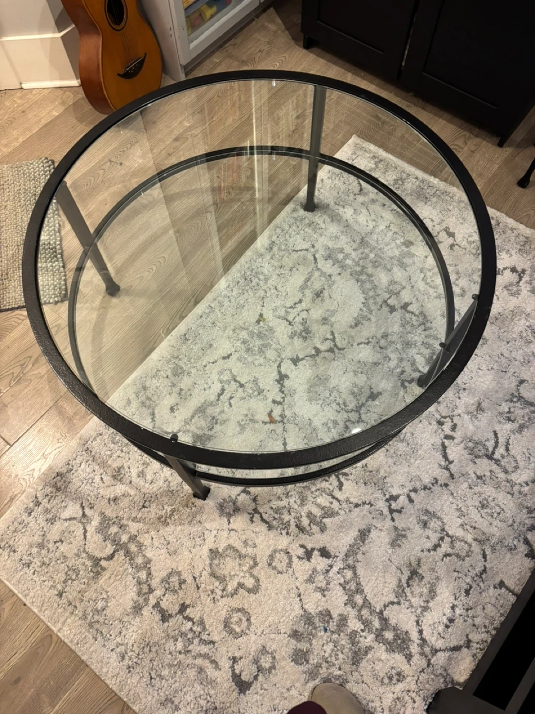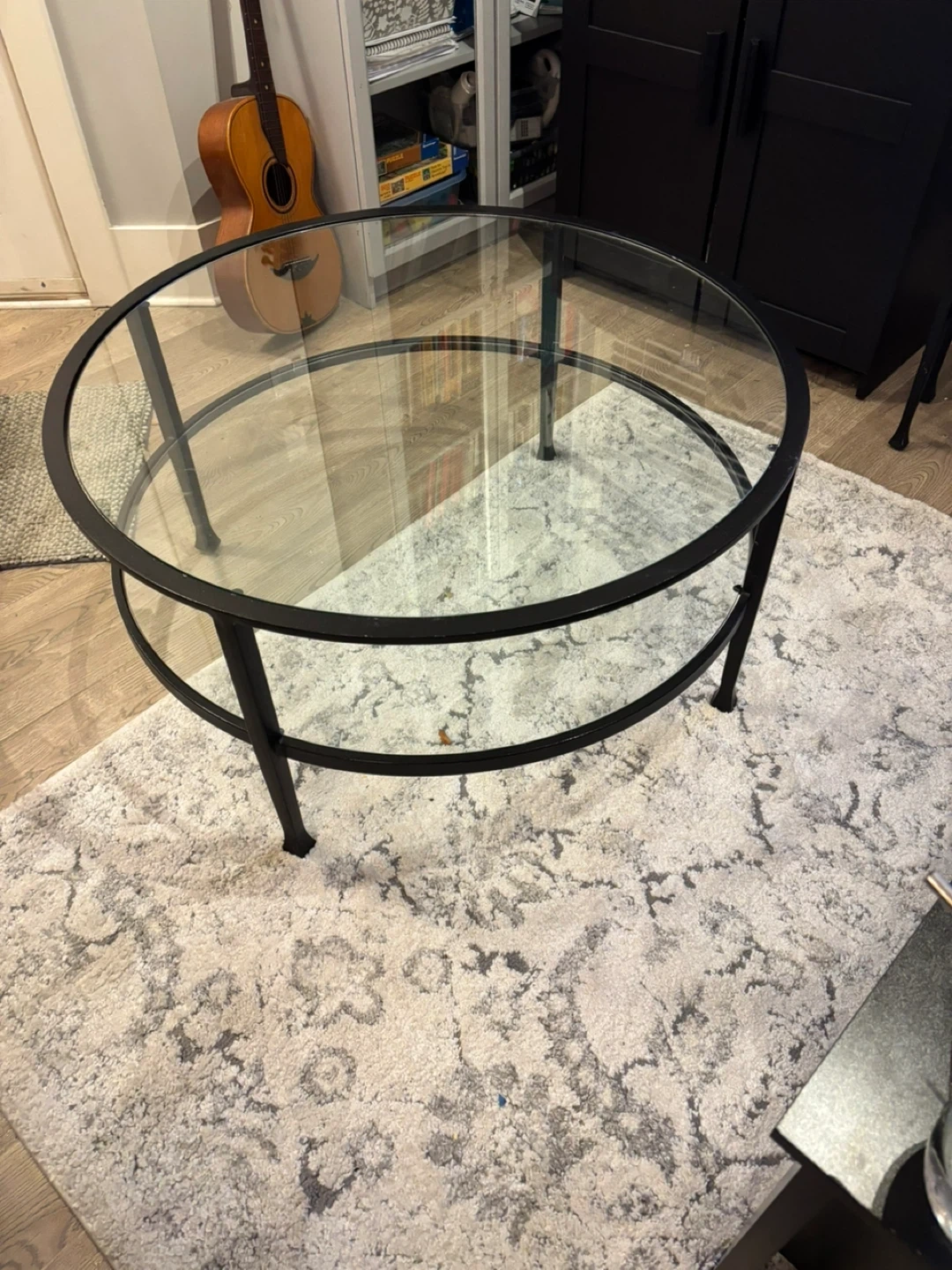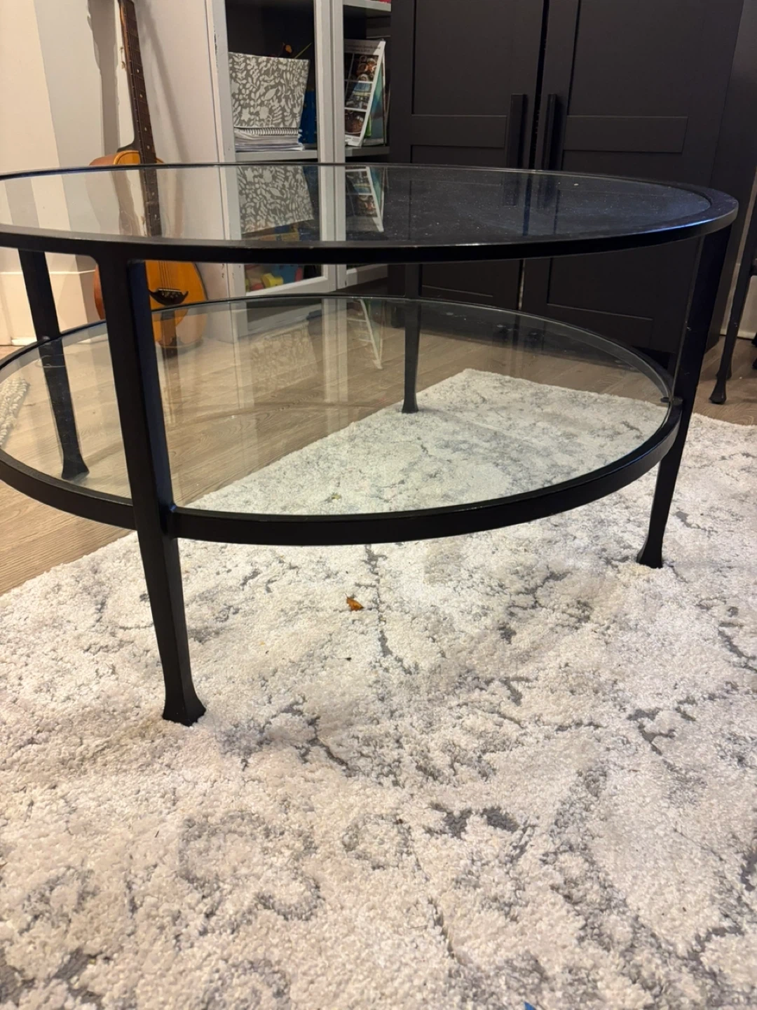 Pottery Barn - Selling a round glass coffee table with a black metal frame. It has a modern look with a glass top and a lower glass shelf for storage or display. It's in great condition and would look great in any living room!