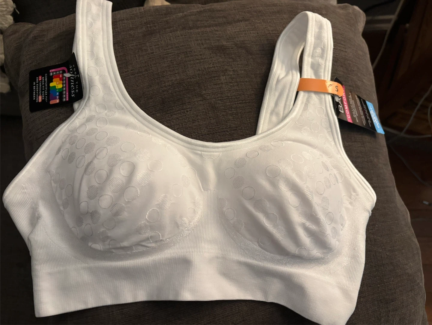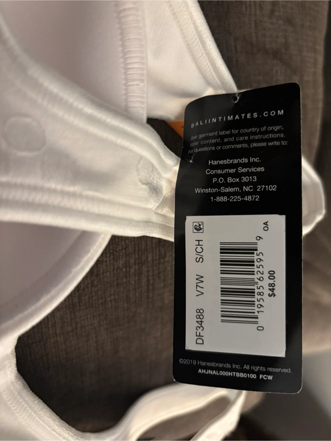 new Bali ComfortFlex Fit Bra in size small! It's white and features a ComfortFlex Fit design that adapts to your shape. The bra has built-up sides and back for incredible smoothing, plus wide, no-slip straps that stay in place. The knit-in zones provide targeted support. Originally bought for $48