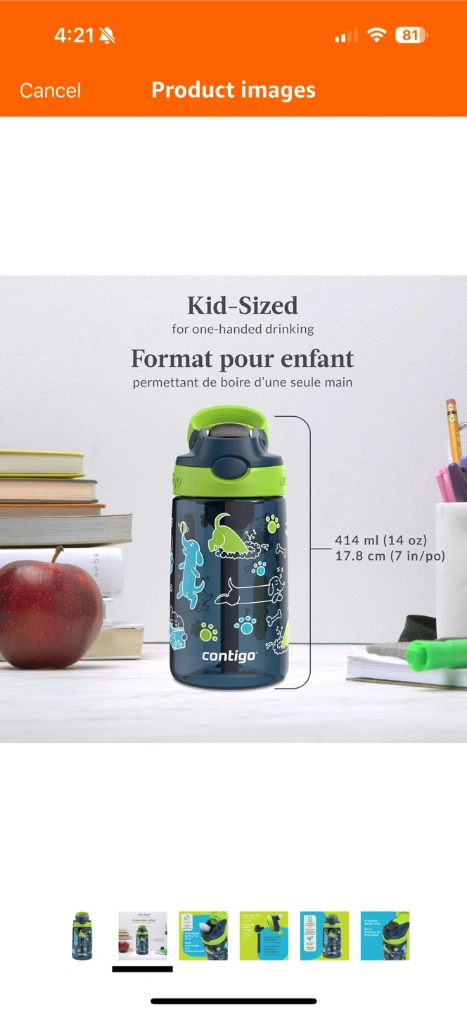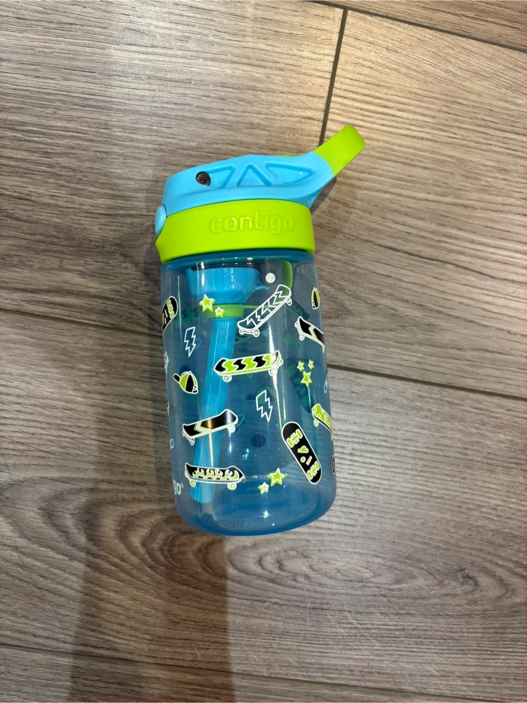 Contigo kids water bottle with a fun skateboard design! It's in excellent shape and ready for a new owner. Washed it, but never used it. PLEASE SEE PHOTOS. Pick up in the Yonge and Finch area.