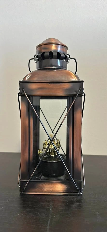 This item comes with its original box. In nearly brand new condition. This vintage style oil lantern will add to anyone’s home. Has a copper finish with glass panels.