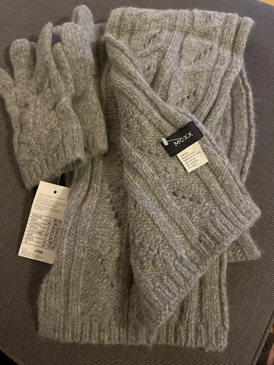 Cozy up with this lovely scarf and gloves set from Mexx! The set is a soft grey colour and made with a blend of wool, angora, and nylon. Perfect for keeping warm during those chilly Canadian days! Brand new with tags!