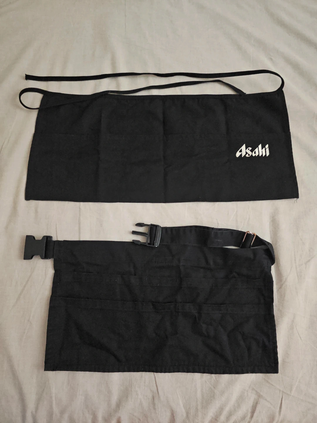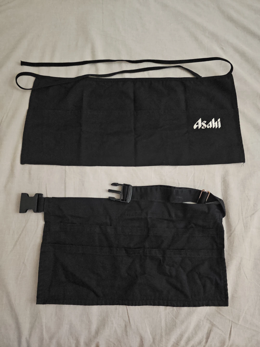 Selling a set of black aprons, including a full apron and a waist apron. The waist apron features the Asahi logo. These are in excellent condition and ready for use!