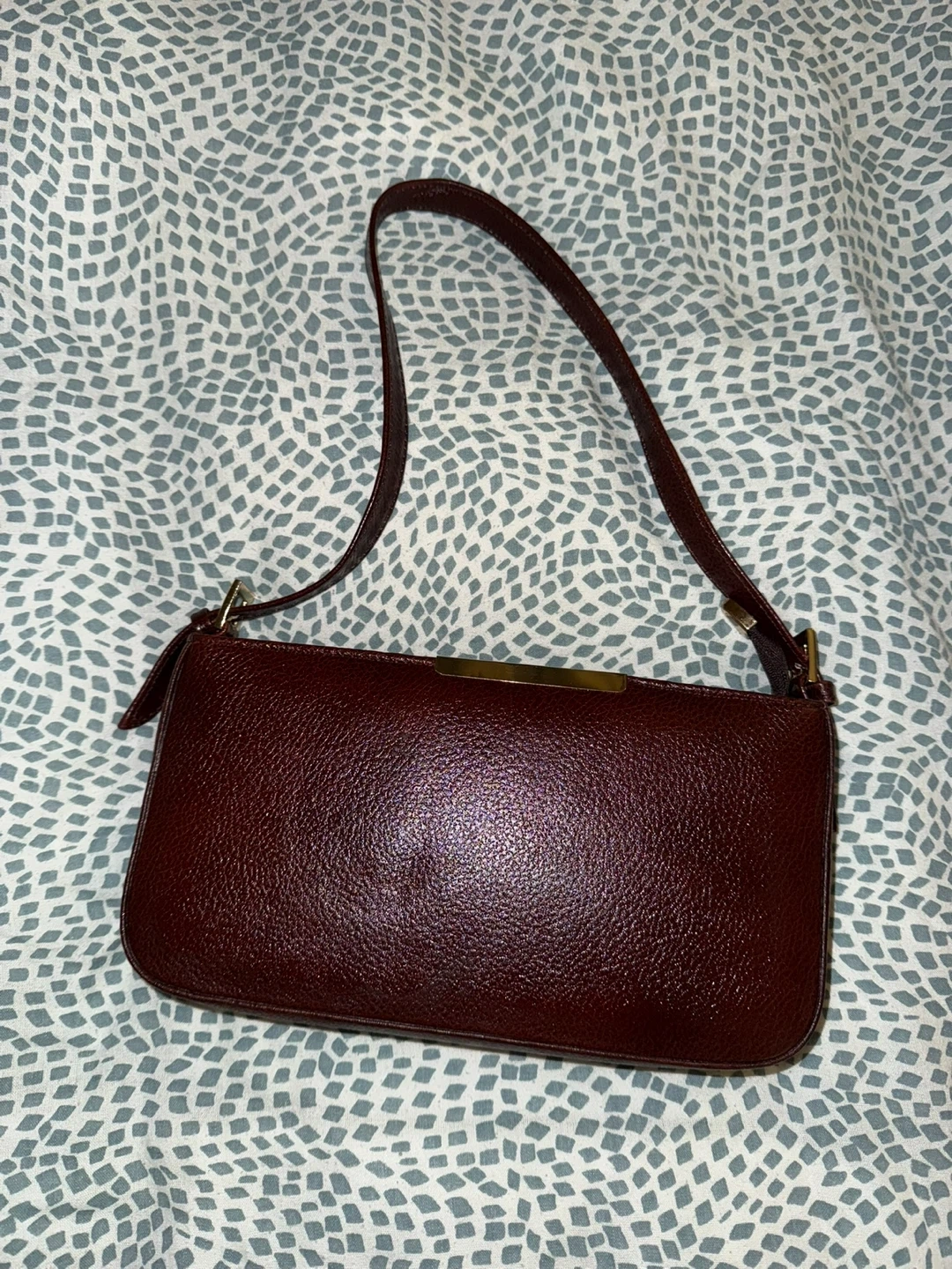 It’s unbranded, no labels or tags to indicate what material it is but it looks like a faux leather with a satin interior.