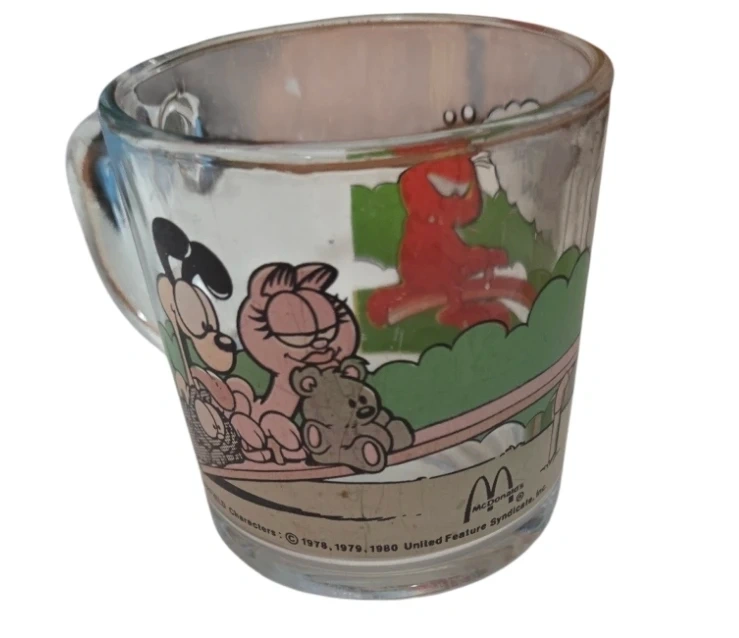 Selling a vintage McDonald's Garfield mug featuring Garfield and friends! It's a clear glass mug with fun cartoon graphics from 1978, 1979, and 1980 United Feature Syndicate. A nostalgic piece for collectors or Garfield fans!