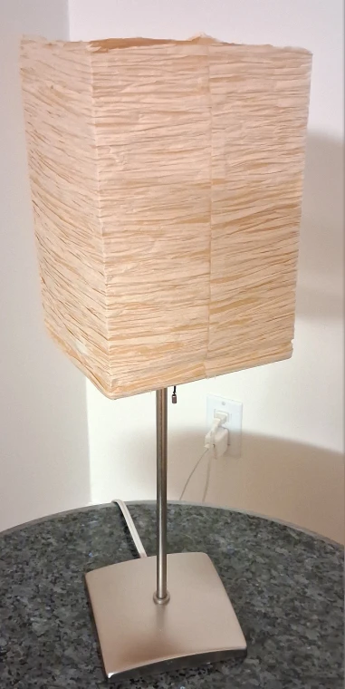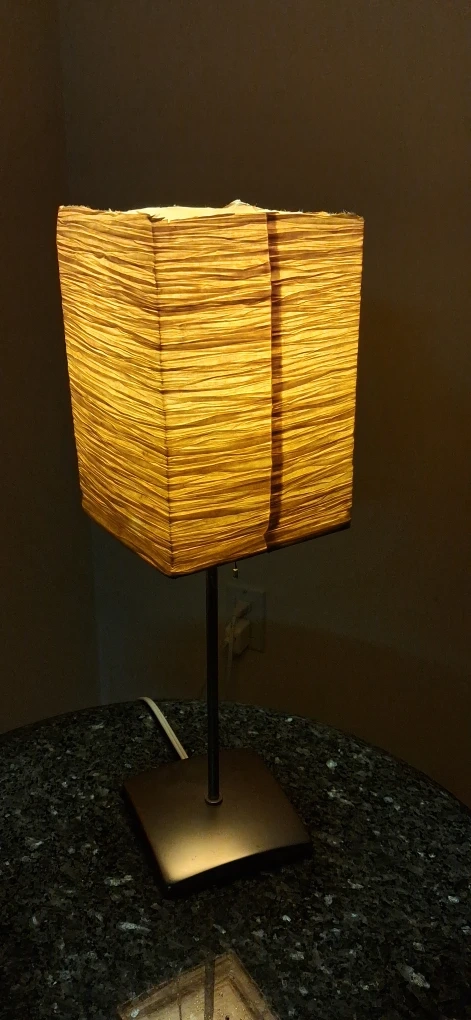 Here's a stylish table lamp that would look great in any room! It features a unique square shade that gives off a warm and inviting glow. The lamp has a modern design with a sleek base. It's in great condition and ready to brighten up your space