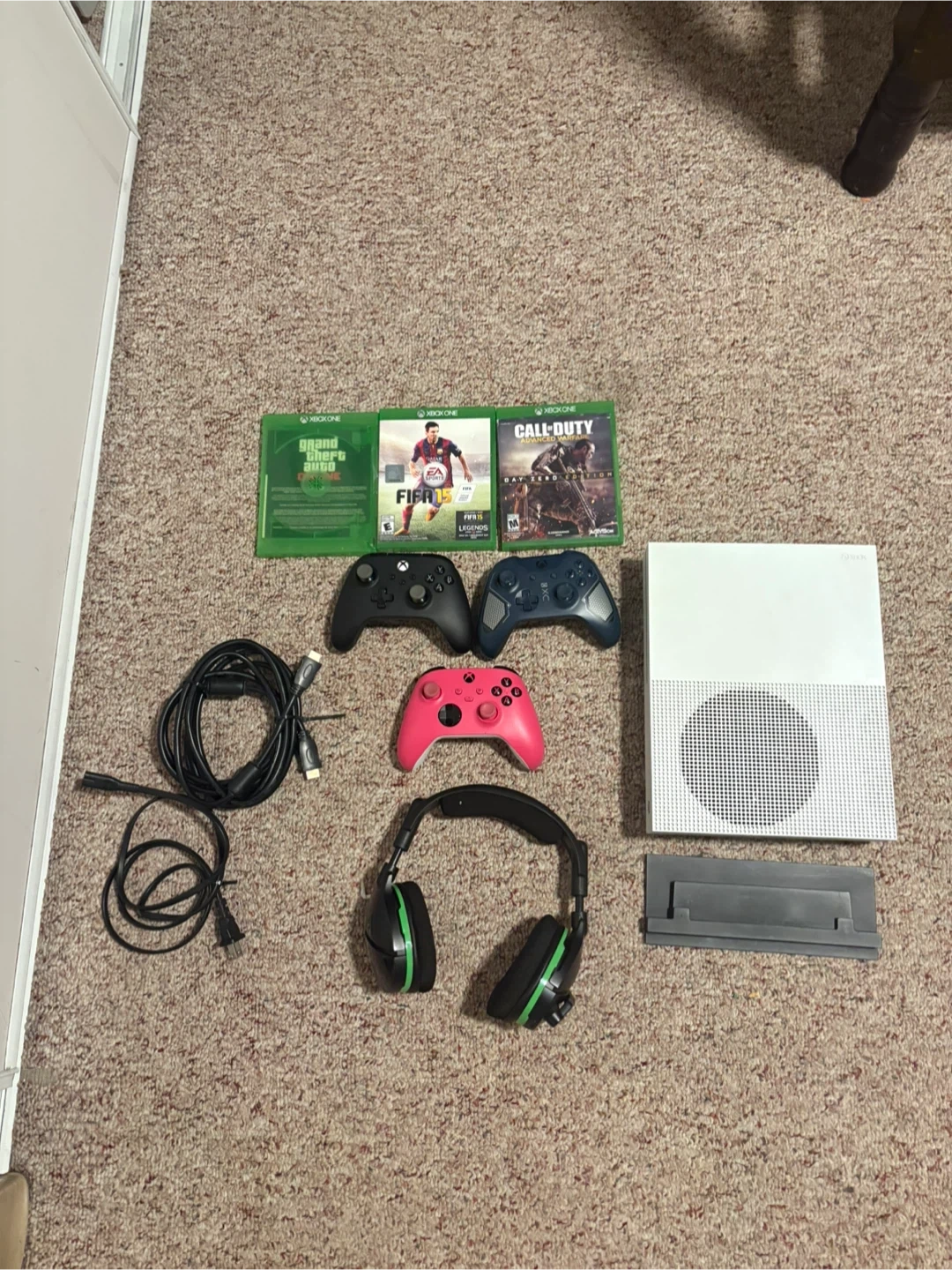 Selling an Xbox One S console with a few games, controllers, and a Turtle Beach headset. Includes the console stand, power cable, and HDMI cable. Also included are 3 Xbox One games and three controllers (black, blue, and pink).
