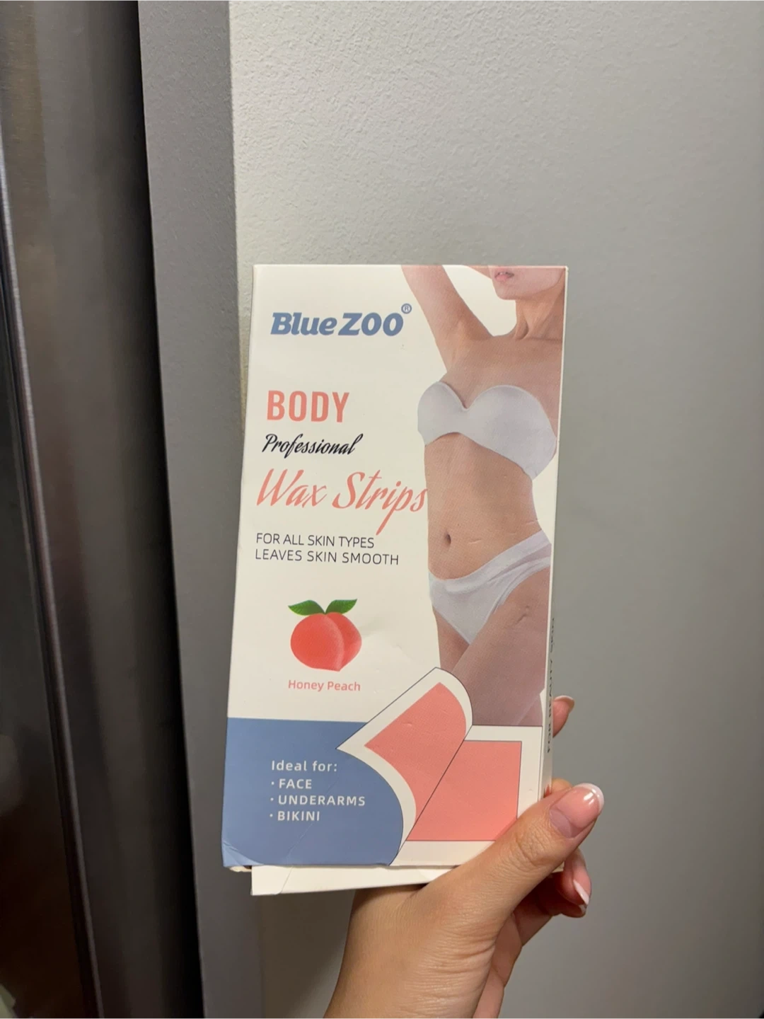 Selling a box of Blue ZOO Body Wax Strips in Honey Peach scent. These are professional wax strips designed for all skin types, leaving skin smooth. Ideal for face, underarms, and bikini area