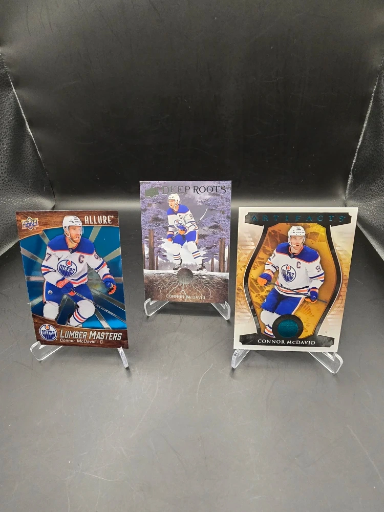 Selling a set of Connor McDavid hockey trading cards. Includes cards from Upper Deck's Allure, Artifacts, and Deep Roots collections. Great for any Oilers fan or hockey card collector!