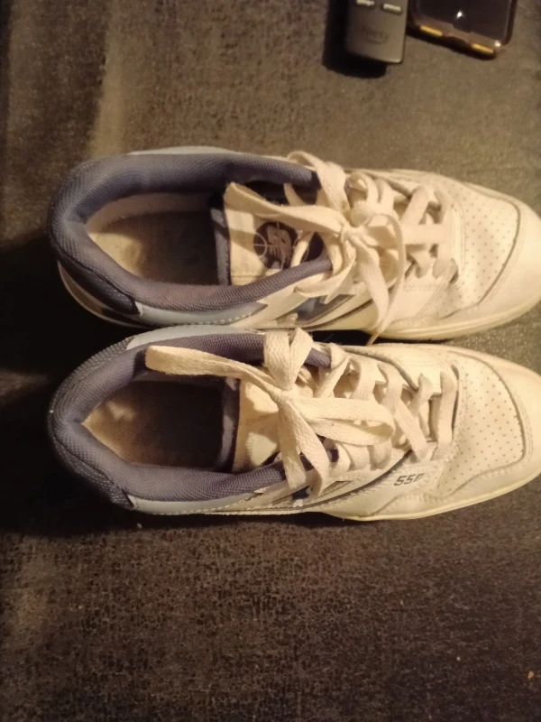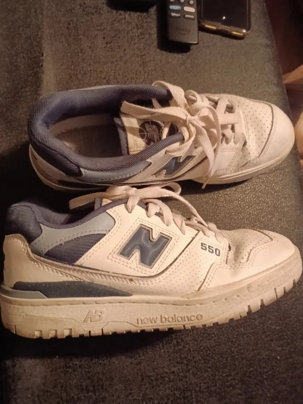Selling a pair of New Balance 550 sneakers in white and blue. These shoes have the iconic 'N' logo and a classic design. They show some signs of wear but are still in good condition for casual wear. They're perfect for adding a retro touch to your everyday style!