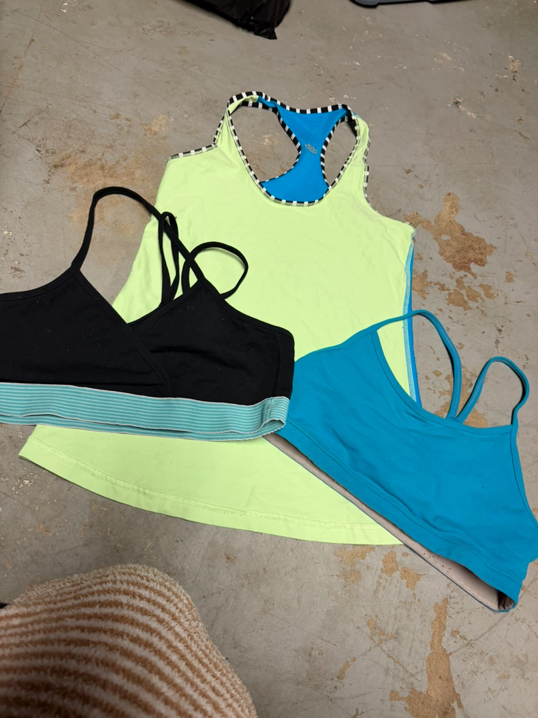 Selling a set of Lululemon activewear! Includes a neon yellow tank top and two sports bras, one black and one blue. Perfect for your workouts!