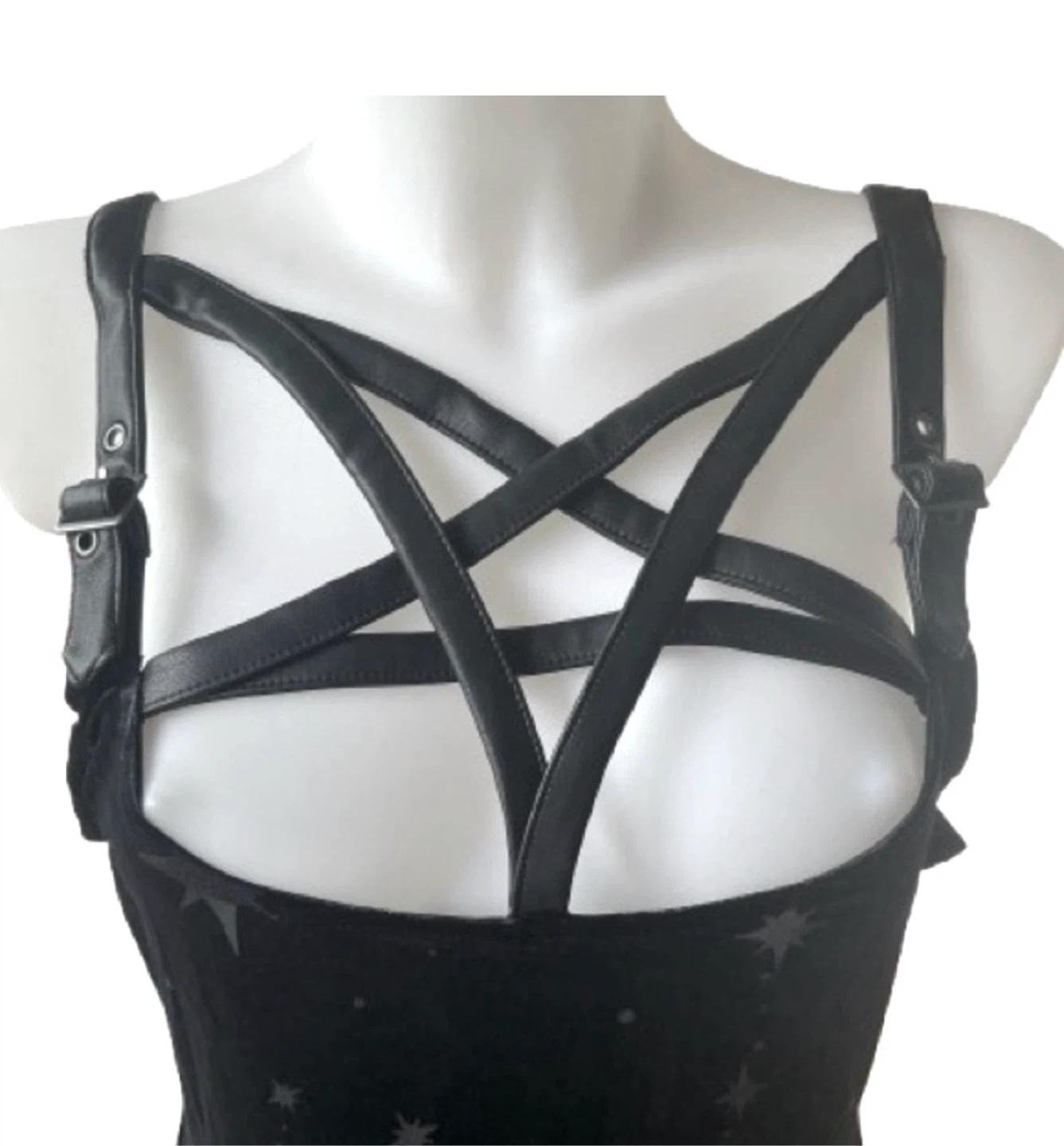 Featuring Vegan Leather adjustable shoulder straps and a strappy pentagram neckline, this maxi-length dress exudes enchantment and individuality.