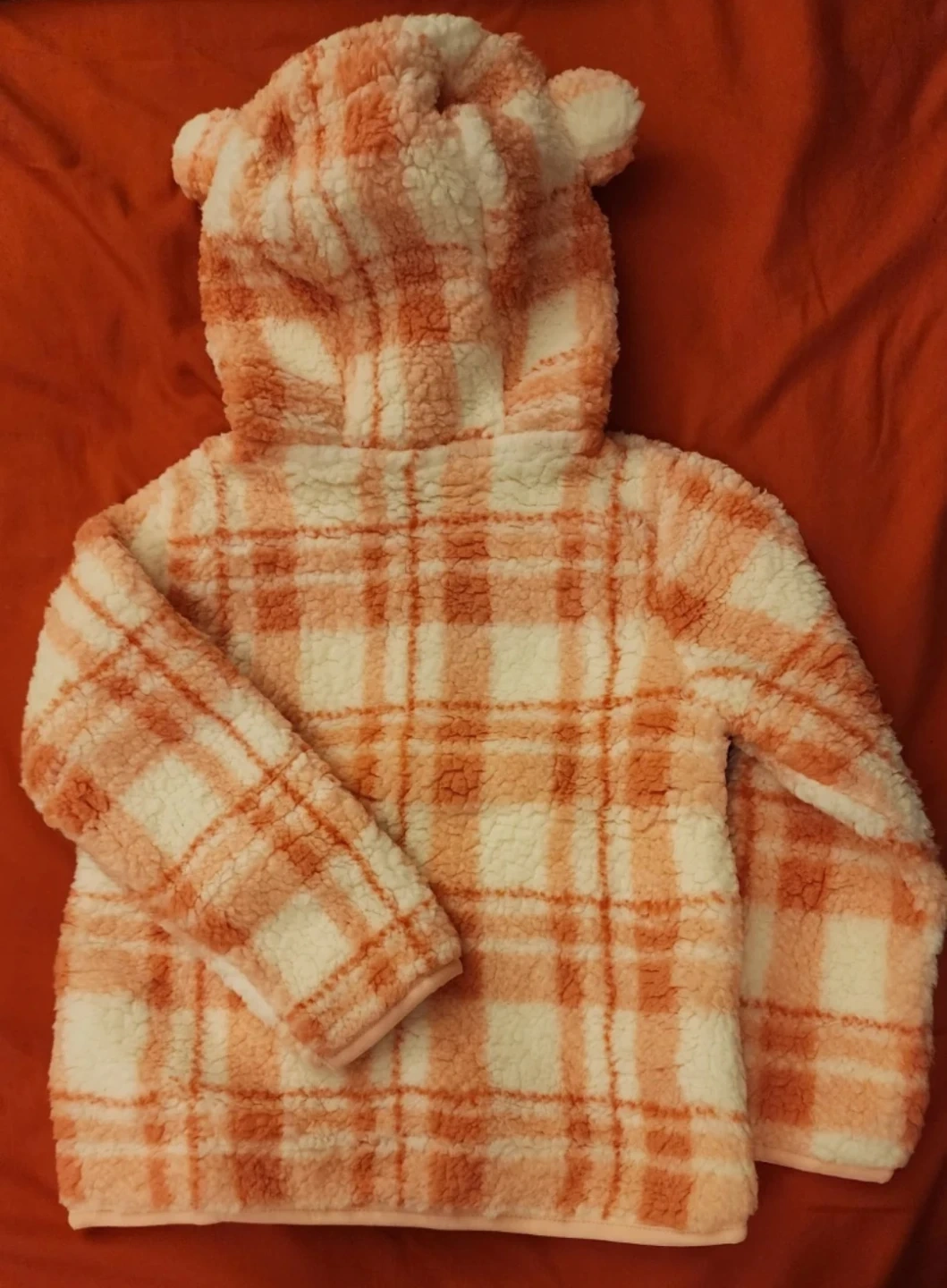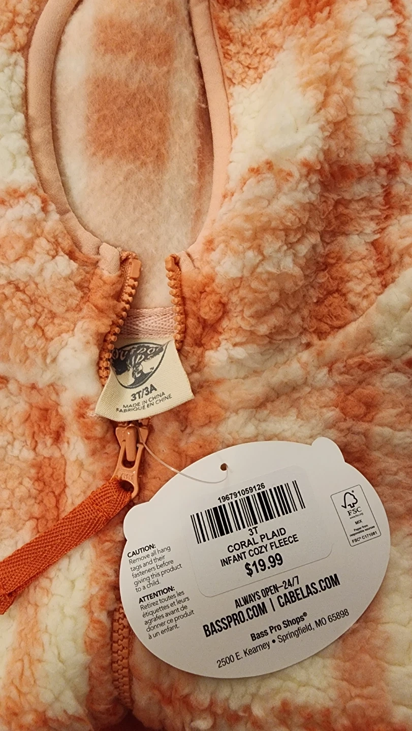 This cozy infant fleece from Bass Pro Shops is brand new with tags! It features a coral and white plaid pattern and a hood. It's a size 3T, perfect for keeping your little one warm and snug.