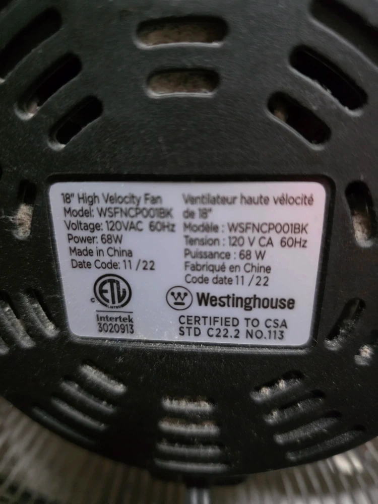 Selling a Westinghouse 18" high velocity fan. It's in great shape and ready to keep you cool! The model number is WSFNCP001BK. It runs on 120VAC 60Hz and uses 68W of power