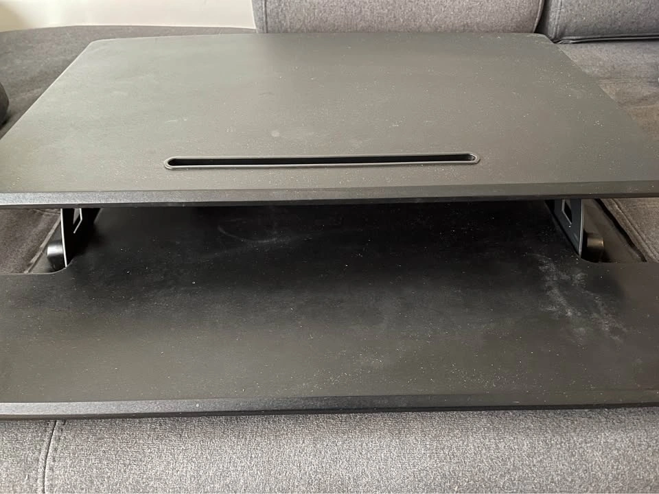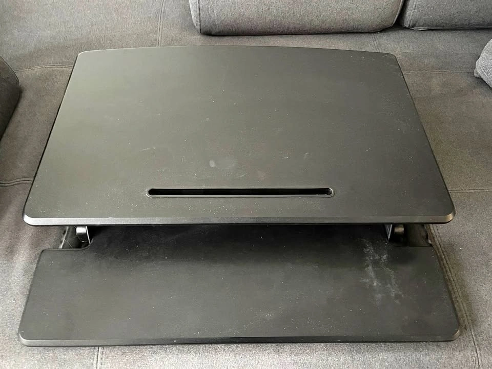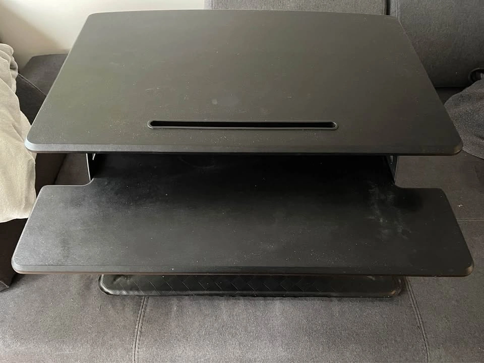 Standing desk that goes on top of your desk/table to raise up your laptop/etc to standing height. Has a section for the keyboard/mouse, and separate for laptop/monitor. Hydraulic system, it can be stopped at various heights.