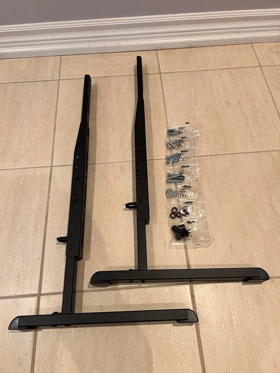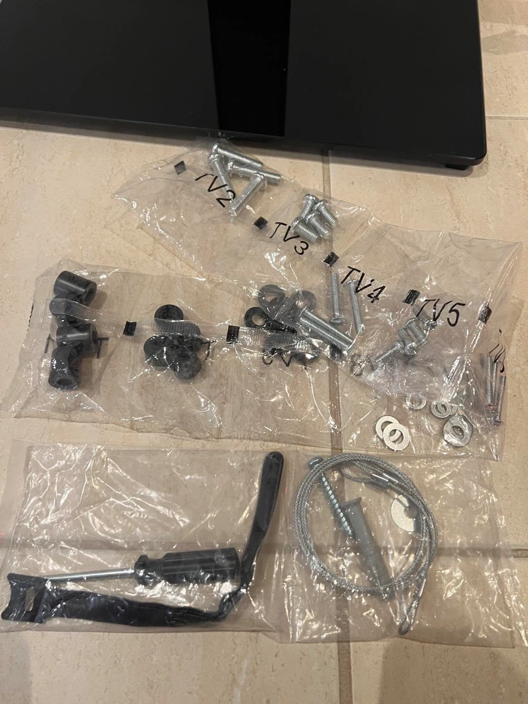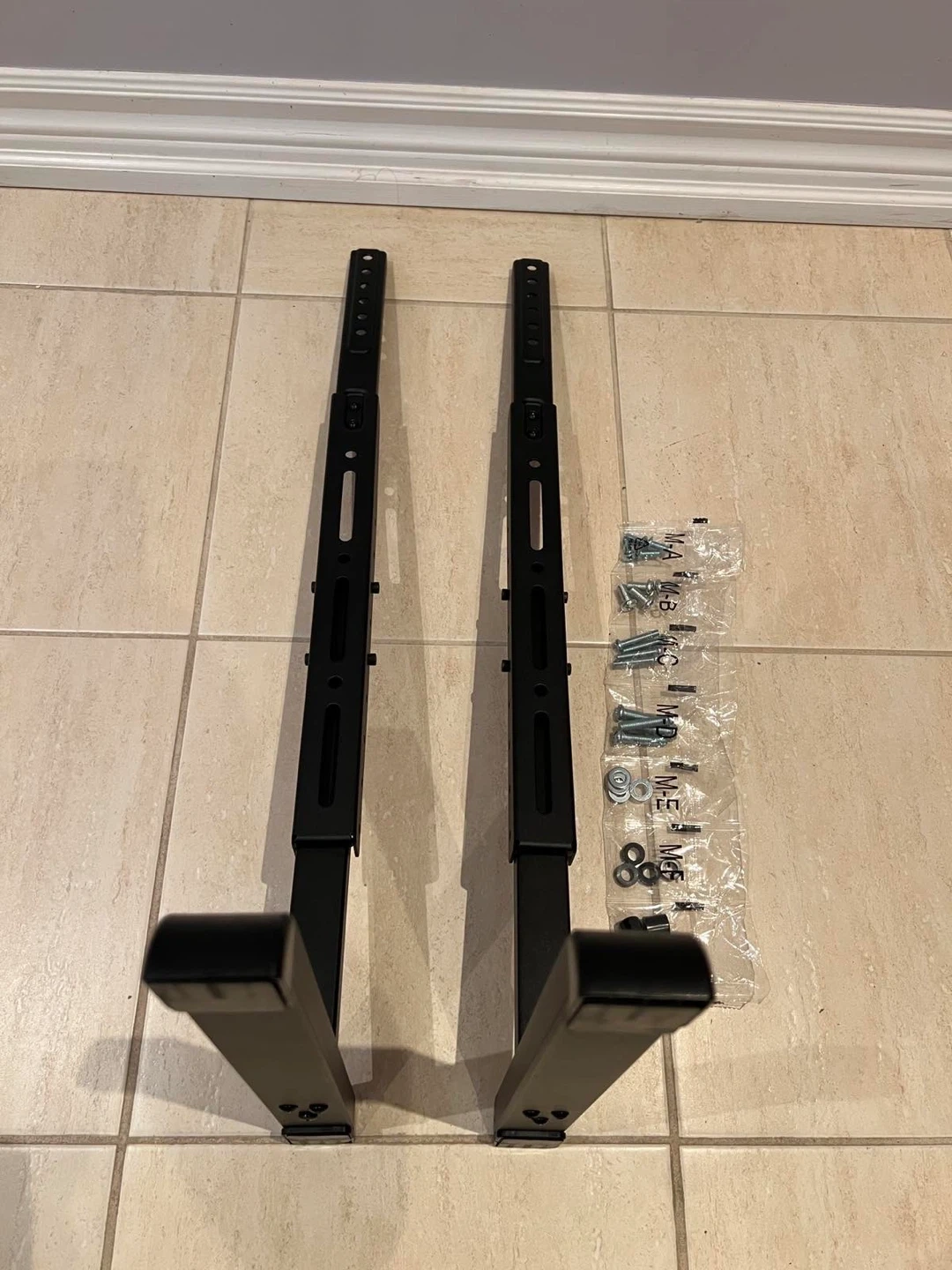 Selling a set of universal TV stand legs in black. Includes all the necessary screws and hardware in their original packaging. The legs are approximately 27 inches tall.