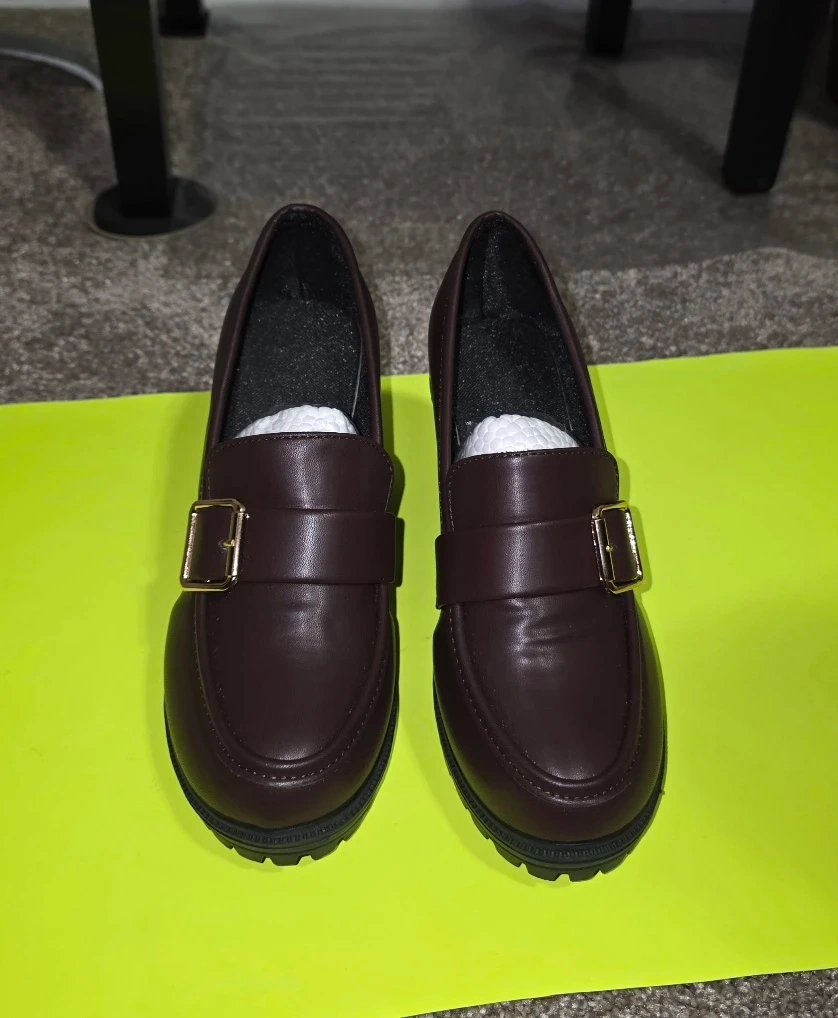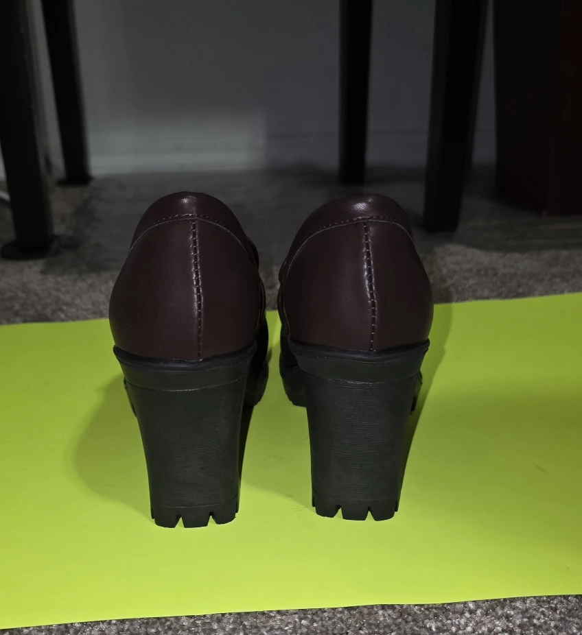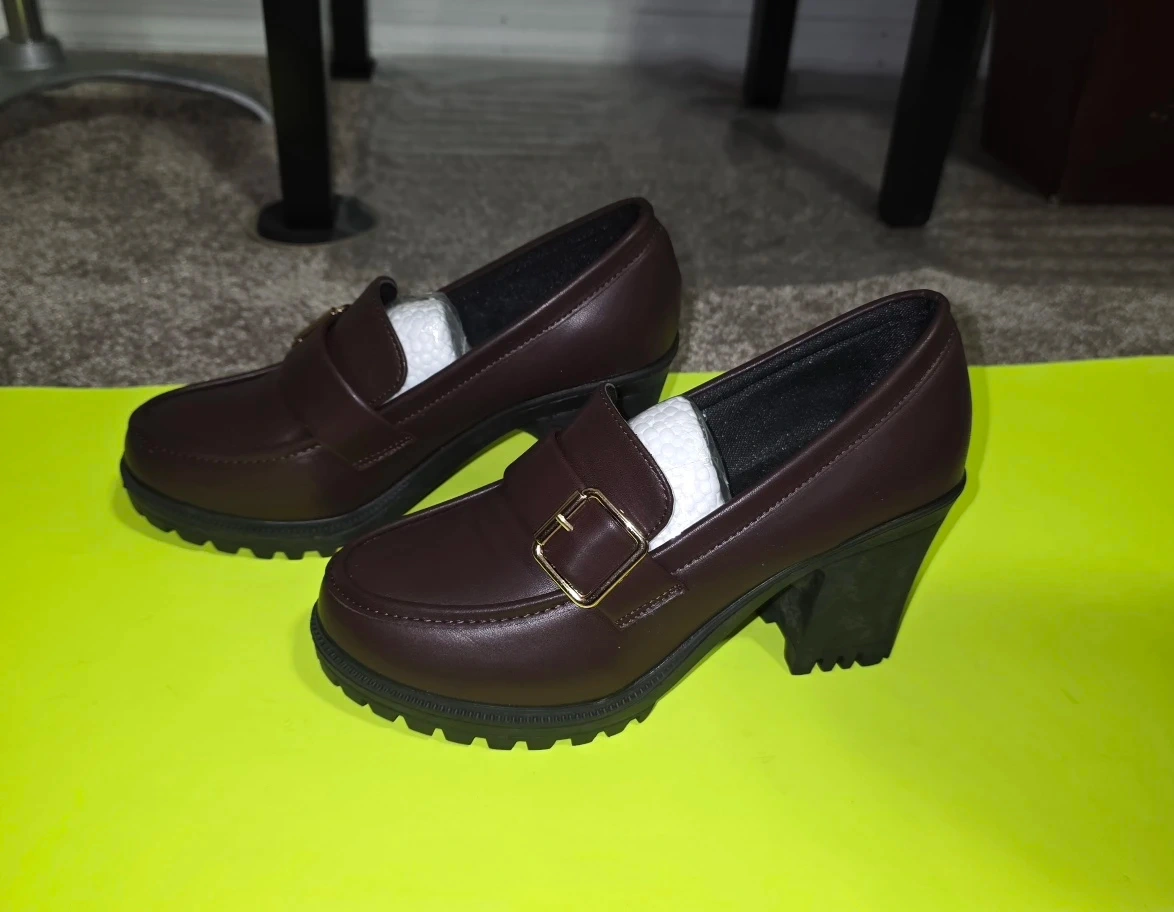 These dark burgundy heeled loafers have never been worn. They have a chunky heel and a gold buckle detail. Perfect for dressing up or down!