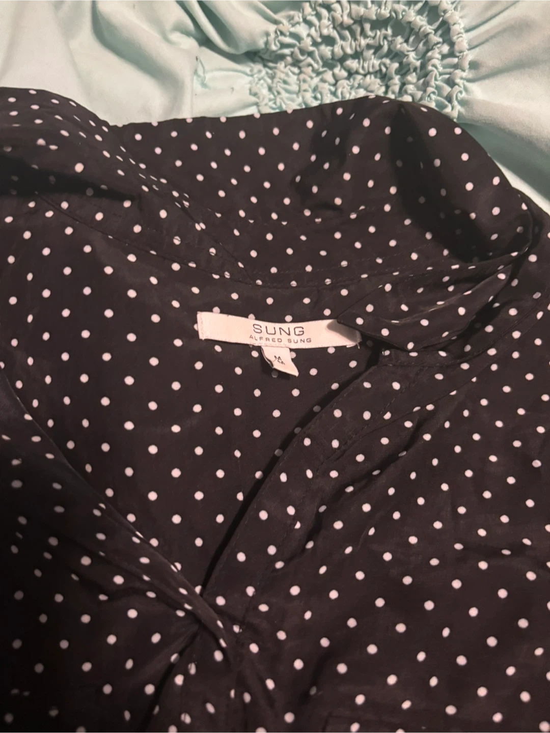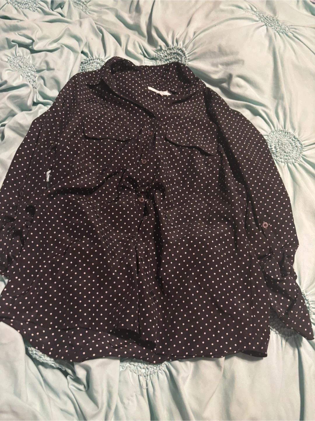 Here's a cute Alfred Sung blouse up for grabs! It's black with a white polka dot pattern and is a size medium. Perfect for adding a touch of fun to your wardrobe!