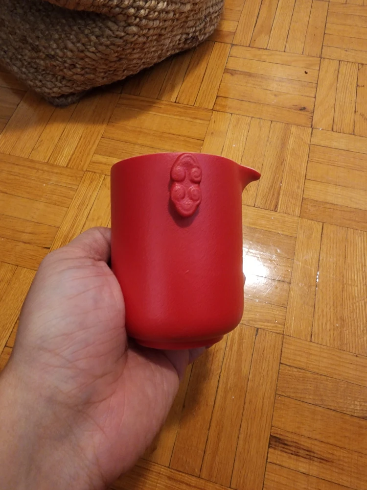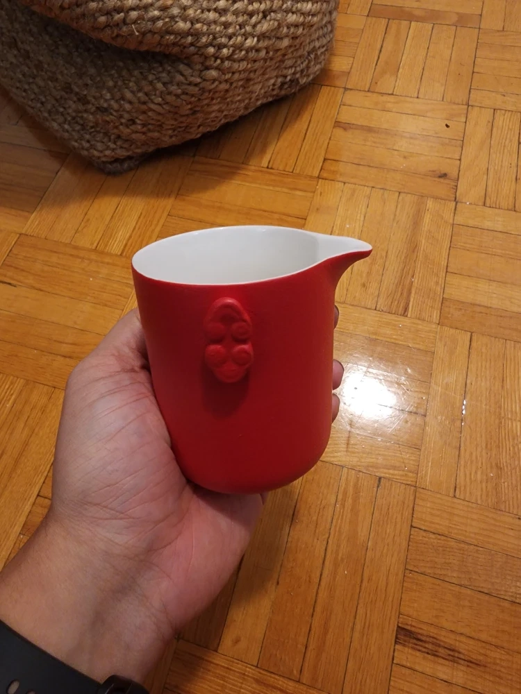 I'm donating a cute red ceramic tea pitcher. It's in great condition and ready for a new home in your tea set. The inside is white, and it has a unique design on the outside!