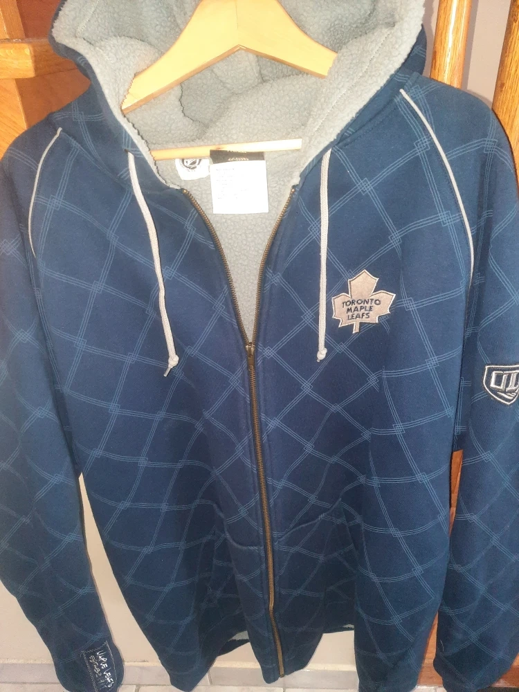 Cozy Old Time Hockey Toronto Maple Leafs Full-Zip Hoodie! It's a size Adult - XXL. The outer material is a navy blue with a subtle diamond pattern, and the inside is a soft, light blue fleece. Perfect for showing your team spirit on chilly days.