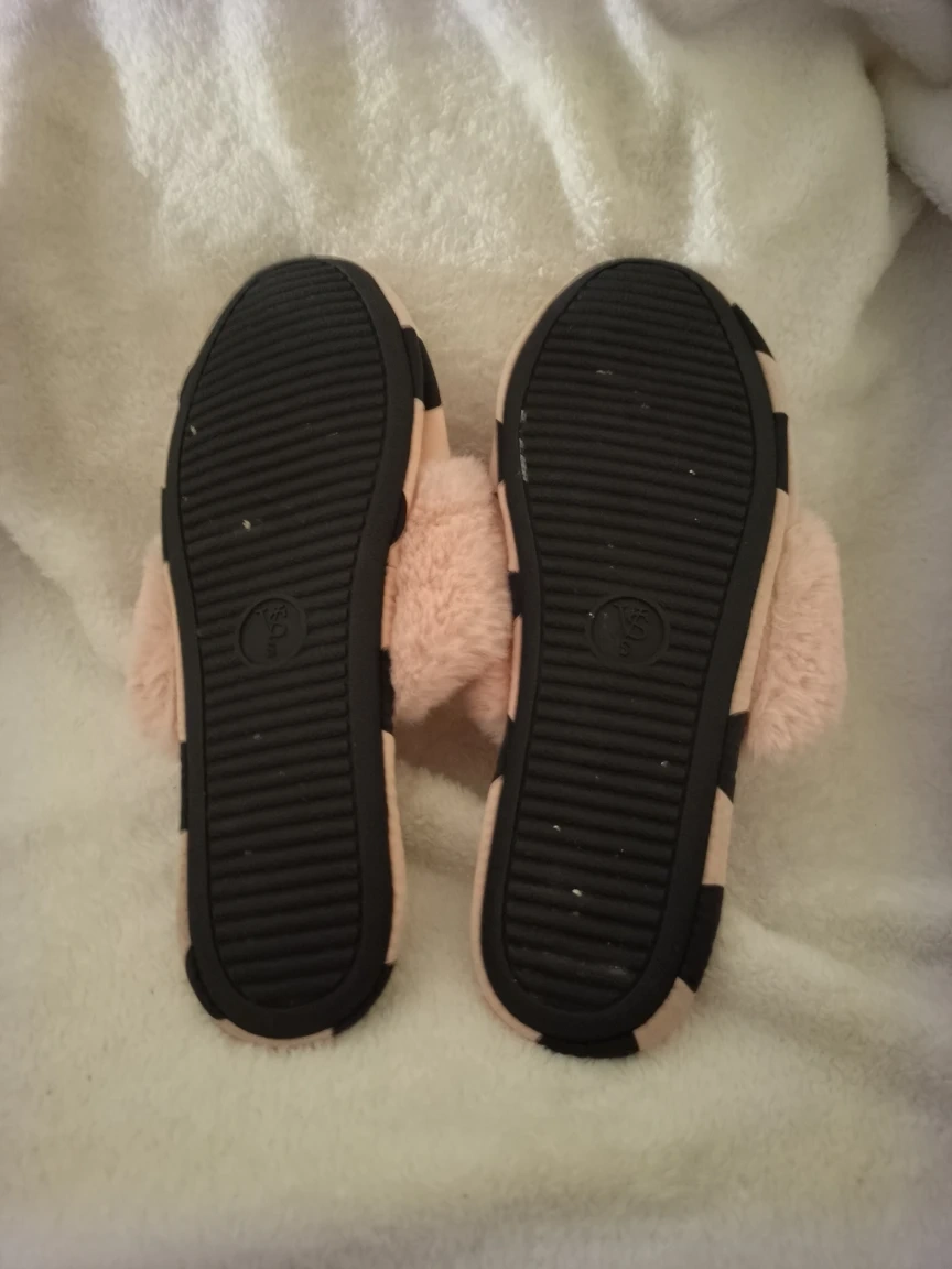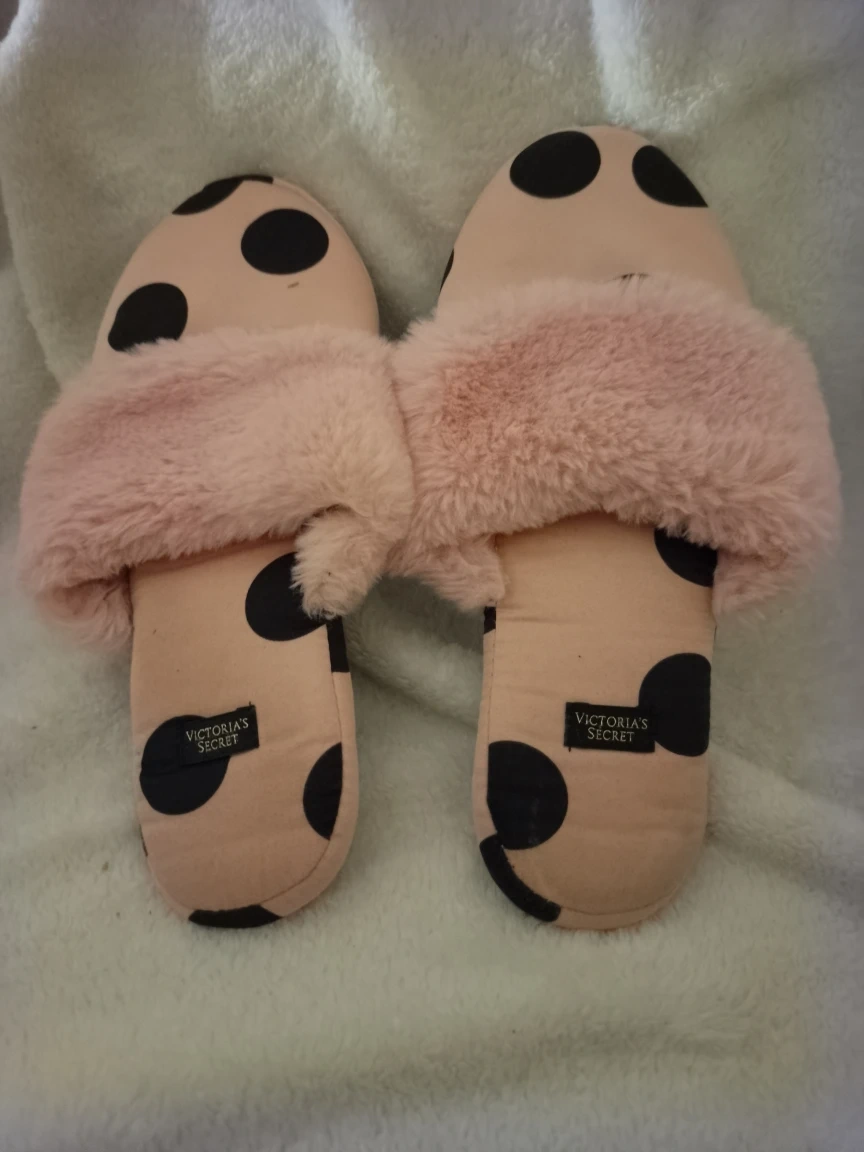 Selling a pair of Victoria's Secret pink slippers with black polka dots! They are in great condition and super comfy for lounging around the house