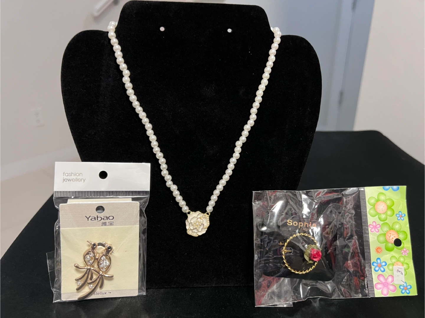 Selling a jewellery set that includes a pearl necklace, a Yabao brooch, and rose ring brooch. All items are brand and ready to accessorize your outfits and as gift for Christmas.