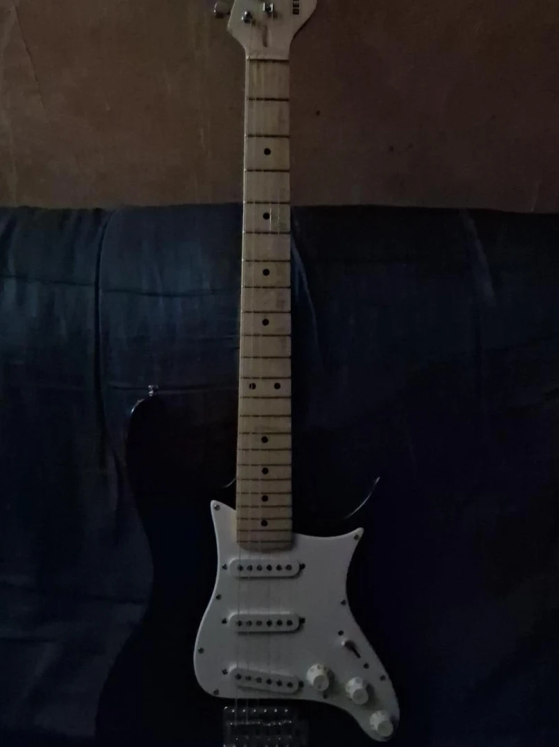 Selling a black electric guitar. It's in good condition and ready for a new player or someone looking to upgrade their current instrument